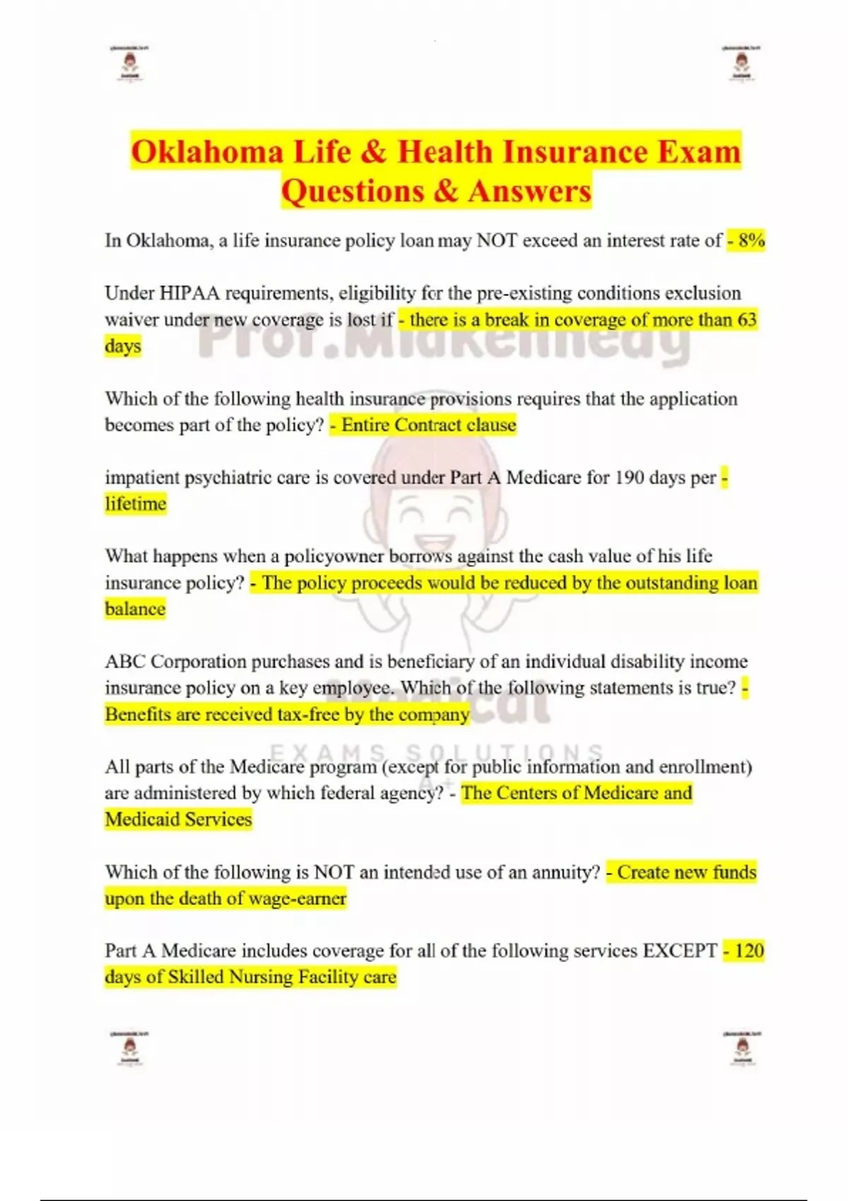 Oklahoma Life & Health Insurance Exam Questions & Answers-In Oklahoma, a life insurance policy loan may NOT exceed an interest rate of - 8% Under HIPAA requirements, eligibility for the pre-existing conditions exclusion waiver under new coverage is lost if - there is a break in coverage of more than 63 days Which of the following health insurance provisions requires that the application becomes part of the policy? - Entire Contract clause impatient psychiatric care is covered under Part A Medicare for 190 days per - lifetime What happens when a policyowner borrows against the cash value of his life insurance policy? - The policy proceeds would be reduced by the outstanding loan balance ABC Corporation purchases and is beneficiary of an individual disability income insurance policy on a key employee. Which of the following statements is true? - Benefits are received tax-free by the company All parts of the Medicare program (except for public information and enrollment) are administered by which federal agency? - The Centers of Medicare and Medicaid Services Which of the following is NOT an intended use of an annuity? - Create new funds upon the death of wage-earner Part A Medicare includes coverage for all of the following services EXCEPT - 120 days of Skilled Nursing Facility care Which of these factors does NOT affect the life insurance premium rates? - Producer Certification A license is NOT required when you are - providing referrals Producers must complete a total of ___ Continuing Education credits for each two-year licensing period. - 24 Which life insurance policy would be eligible to include an automatic premium loan provision? - Whole life A Guaranteed Renewable provision allows - premiums which can only be increased per rate class An insurance producer is BEST defined as - a person who has a contract with an insurance company to represent it If a new policy is replacing an existing one, the insured is given the right to return for a full refund of at least how many days after policy delivery. - 20 All of these are used to prevent adverse selection in a group dental plan EXCEPT - decreased employee participation How long can an insurer legally defer paying the cash value of a surrendered life insurance policy? - 6 months
