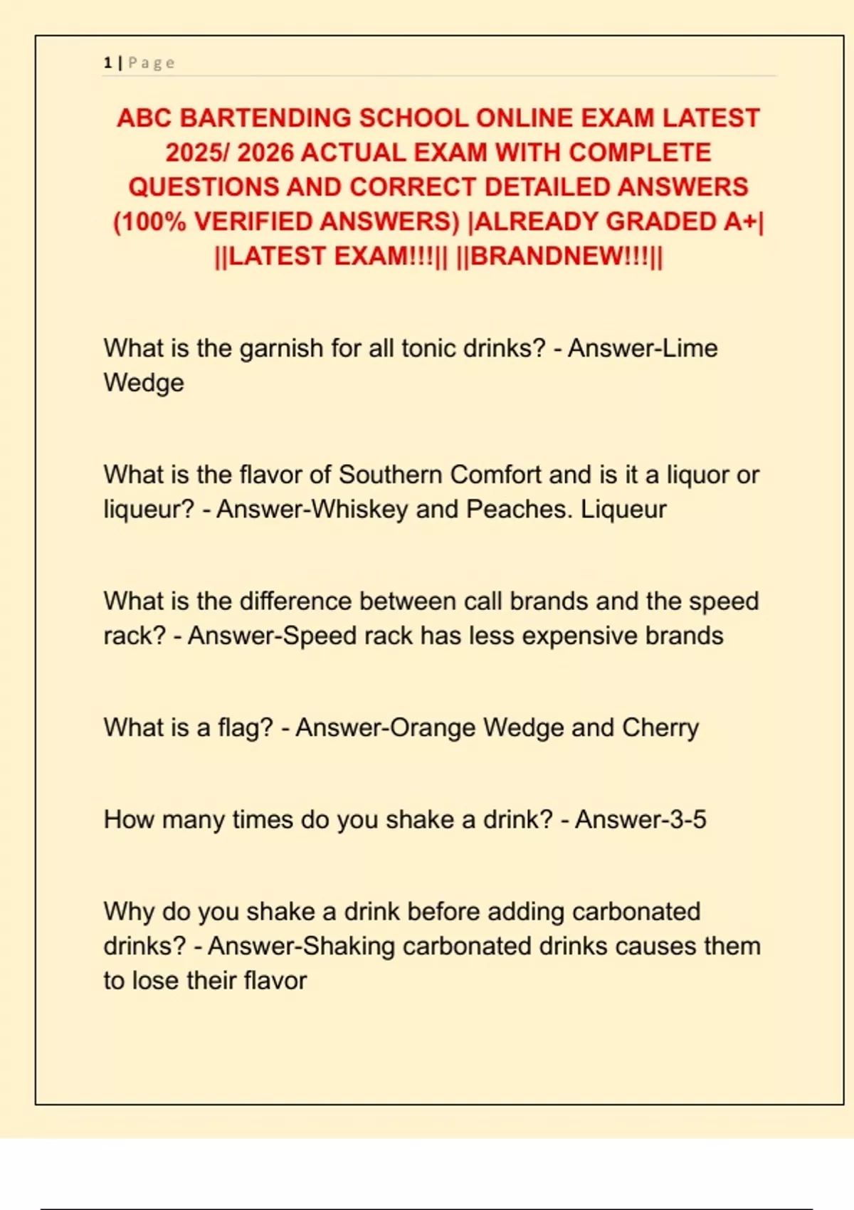ABC BARTENDING SCHOOL ONLINE EXAM LATEST