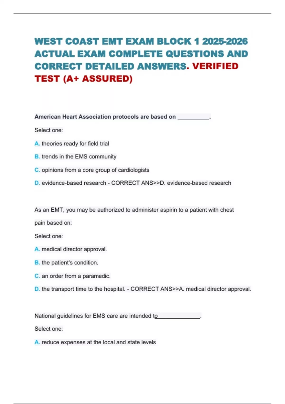 WEST COAST EMT EXAM BLOCK ACTUAL EXAM COMPLETE QUESTIONS AND CORRECT DETAILED ANSWERS. VERIFIED TEST (A+ ASSURED) American Heart Association protocols are based on . Select one: A. theories ready for field trial B. trends in the EMS community C. opinions from a core group of cardiologists D. evidence-based research - CORRECT ANSD. evidence-based research As an EMT, you may be authorized to administer aspirin to a patient with chest pain based on: Select one: A. medical director approval. B. the patient's condition. C. an order from a paramedic. D. the transport time to the hospital. - CORRECT ANSA. medical director approval. National guidelines for EMS care are intended to Select one: . A. reduce expenses at the local and state levels B. unify EMS providers under a single medical director C. facilitate a national EMS labor group D. provide more consistent delivery of EMS care across the United States - - CORRECT ANSD. provide more consistent delivery of EMS care across the United States Online medical control requires Select one: A. the presence of an advanced-level provider . B. written protocols approved by medical control C. a physician's presence on the scene of the call D. phone or radio contact with the medical director - CORRECT ANSD. phone or radio contact with the medical director Prehospital patient care decisions should be based on . Select one: A. the experiences of EMTs B. the opinions of physicians C. an EMS agency's fiscal resources D. EMS research - CORRECT ANSD. EMS research The ability to handle multiple tasks based on their priority is called . Select one: A. patient empathy B. patient advocacy C. integrity D. time management - CORRECT ANSD. time management The ability to take appropriate action with little direction is known as . Select one: A. self-motivation B. diplomacy C. time management D. self-confidence - CORRECT ANSA. self-motivation The ability to understand others and have them understand you is known as . Select one: A. self-confidence B. teamwork and diplomacy C. communication D. scene leadership - CORRECT ANSC. communication The determination that prompt surgical care in the hospital is more important than performing time-consuming procedures in the field on a major trauma patient is based MOSTLY on: Select one: A. the lead EMT's decision. B. regional trauma guidelines. C. EMS research. D. local protocols. - CORRECT ANSC. EMS research. The EMT is legally obligated to protect a patient's privacy according to . Select one: A. APGAR B. CQI C. HIPAA D. DCAP - - CORRECT ANSC. HIPAA What is an EMT's primary service area? Select one: A. The only area the EMT is certified to provide patient care B. The main area in which the EMS agency operates C. The area serviced by the EMT's medical director D. The location where the EMT provides essential care during a 9-1-1 call - - CORRECT ANSB. The main area in which the EMS agency operates What should an EMT do to limit errors in the field?