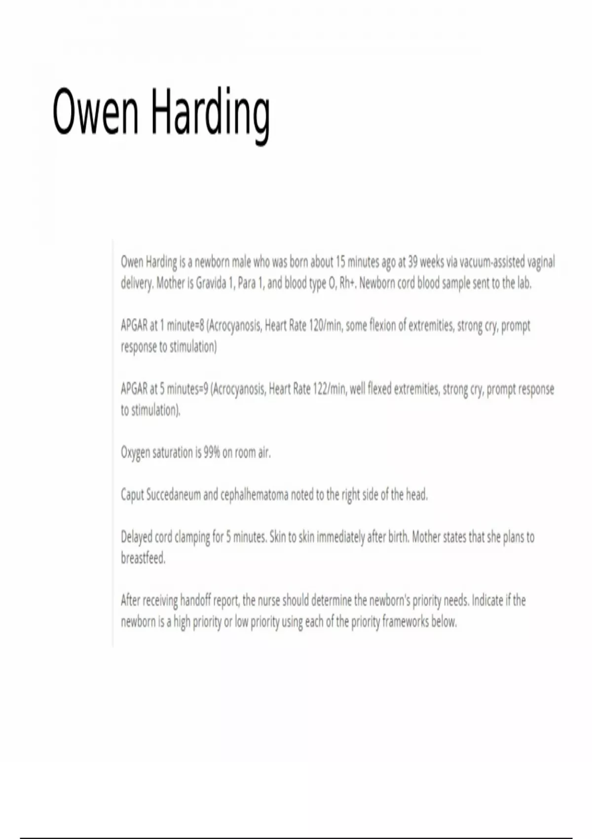 Owen Harding is a newborn male who was born about 15 minutes ago at 39 weeks via vacuum-assisted vaginal