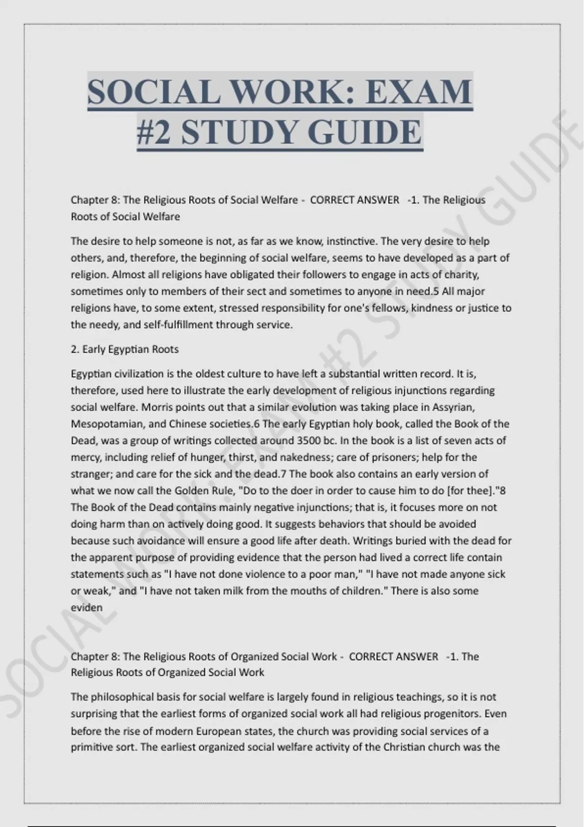 SOCIAL WORK: EXAM #2 STUDY GUIDE Chapter 8: The Religious Roots of Social Welfare - CORRECT ANSWER -1. The Religious Roots of Social Welfare The desire to help someone is not, as far as we know, instinctive. The very desire to help others, and, therefore, the beginning of social welfare, seems to have developed as a part of religion. Almost all religions have obligated their followers to engage in acts of charity, sometimes only to members of their sect and sometimes to anyone in need.5 All major religions have, to some extent, stressed responsibility for one's fellows, kindness or justice to the needy, and self-fulfillment through service. 2. Early Egyptian Roots Egyptian civilization is the oldest culture to have left a substantial written record. It is, therefore, used here to illustrate the early development of religious injunctions regarding social welfare. Morris points out that a similar evolution was taking place in Assyrian, Mesopotamian, and Chinese societies.6 The early Egyptian holy book, called the Book of the Dead, was a group of writings collected around 3500 bc. In the book is a list of seven acts of mercy, including relief of hunger, thirst, and nakedness; care of prisoners; help for the stranger; and care for the sick and the dead.7 The book also contains an early version of what we now call the Golden Rule, "Do to the doer in order to cause him to do [for thee]."8 The Book of the Dead contains mainly negative injunctions; that is, it focuses more on not doing harm than on actively doing good. It suggests behaviors that should be avoided because such avoidance will ensure a good life after death. Writings buried with the dead for the apparent purpose of providing evidence that the person had lived a correct life contain statements such as "I have not done violence to a poor man," "I have not made anyone sick or weak," and "I have not taken milk from the mouths of children." There is also some eviden Chapter 8: The Religious Roots of Organized Social Work - CORRECT ANSWER -1. The Religious Roots of Organized Social Work The philosophical basis for social welfare is largely found in religious teachings, so it is not surprising that the earliest forms of organized social work all had religious progenitors. Even before the rise of modern European states, the church was providing social services of a primitive sort. The earliest organized social welfare activity of the Christian church was the