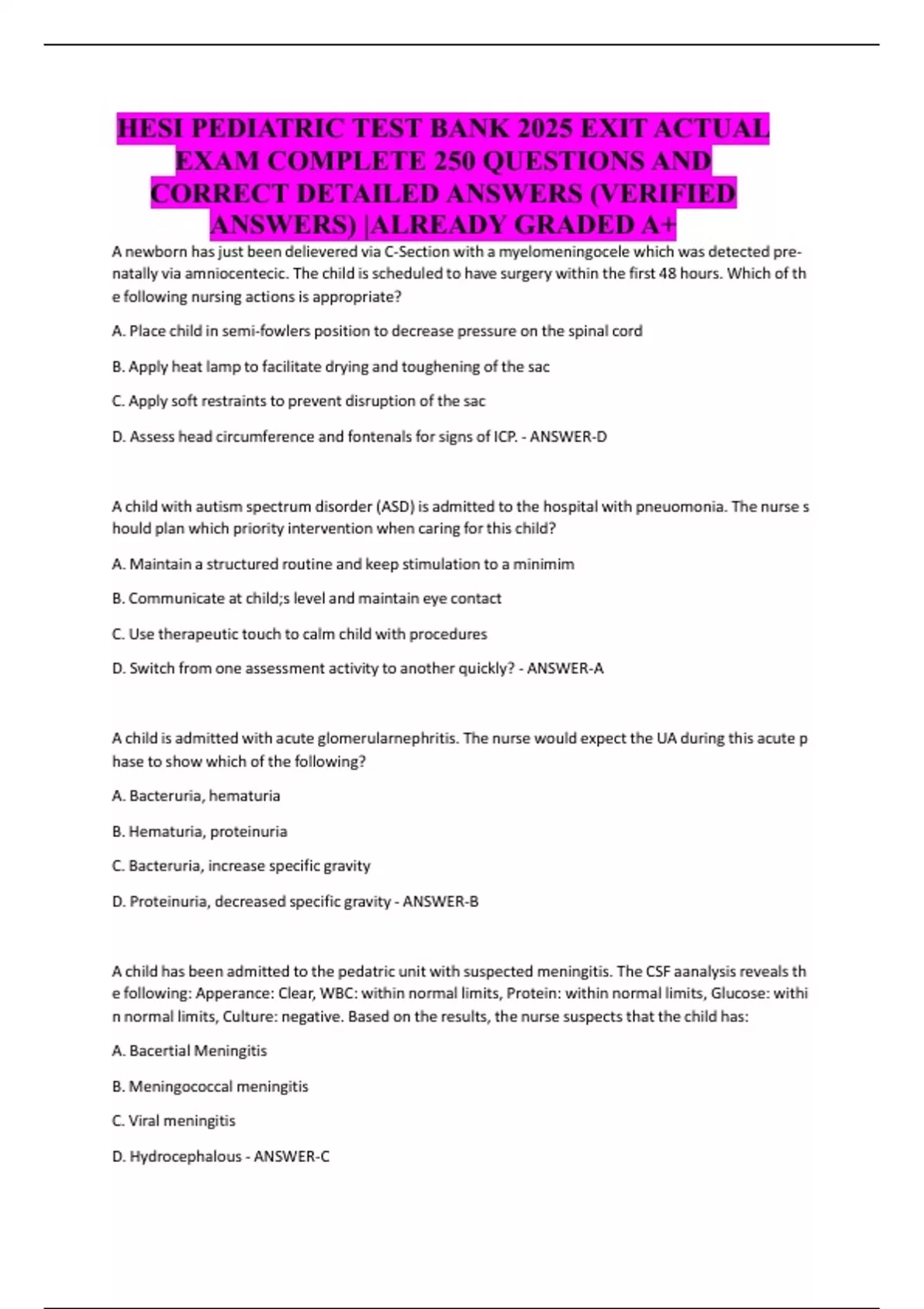 HESI PEDIATRIC TEST BANK 2025 EXIT ACTUAL