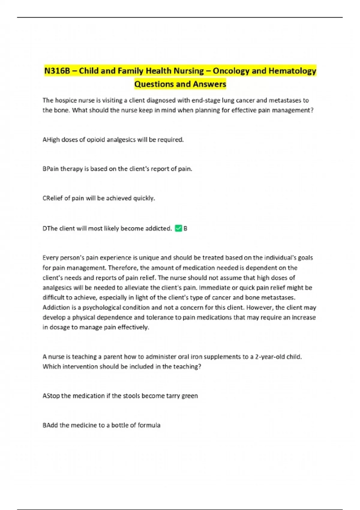 N316B – Child and Family Health Nursing – Oncology and Hematology Questions and Answers