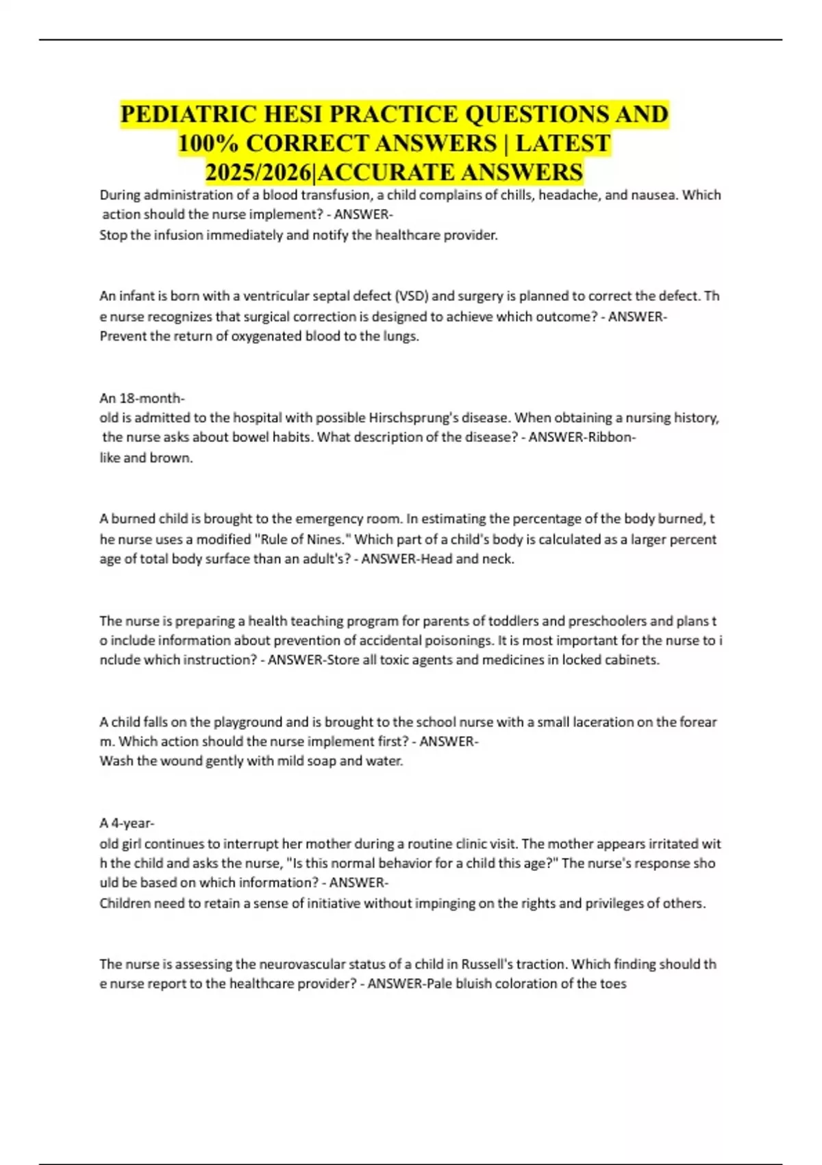 PEDIATRIC HESI PRACTICE QUESTIONS AND