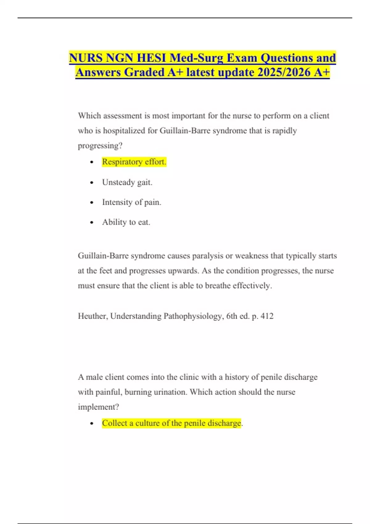 This document includes a comprehensive set of HESI Medical-Surgical (Med-Surg) exam practice questions with detailed, correct answers, reflecting the NGN (Next Generation NCLEX) format. It is designed for nursing students enrolled in NURS 21000 and preparing for the HESI Med-Surg exam during the 2025/2026 academic year. Topics include cardiovascular, respiratory, renal, gastrointestinal, endocrine, and neurological systems, as well as prioritization, delegation, and clinical judgment scenarios.