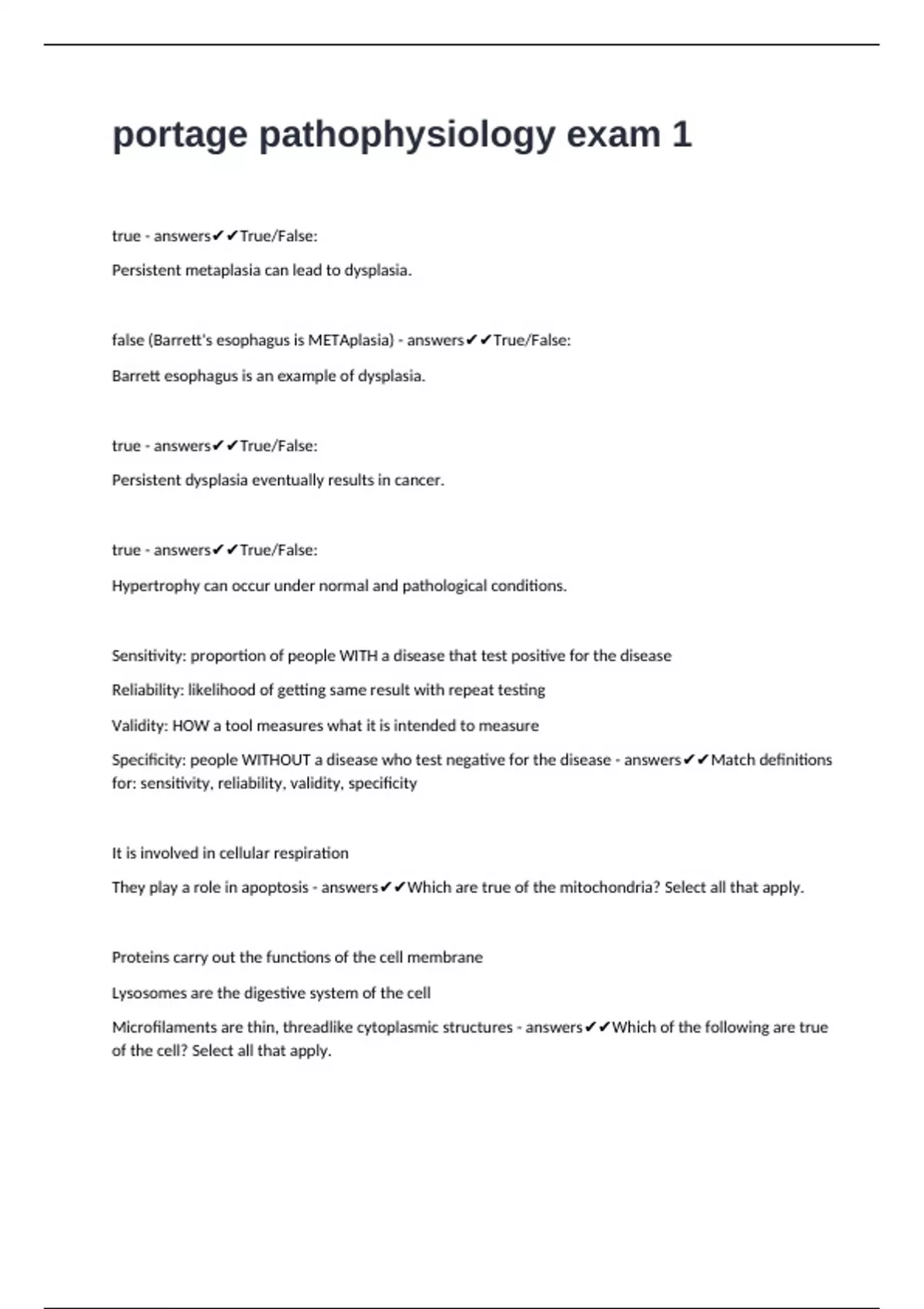 false (Barrett's esophagus is METAplasia) - answers✔✔True/False: