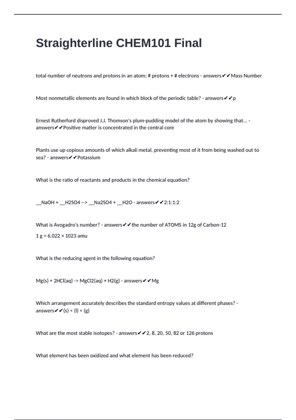 Straighterline CHEM101 Final questions and answers questions and answers questions and answers