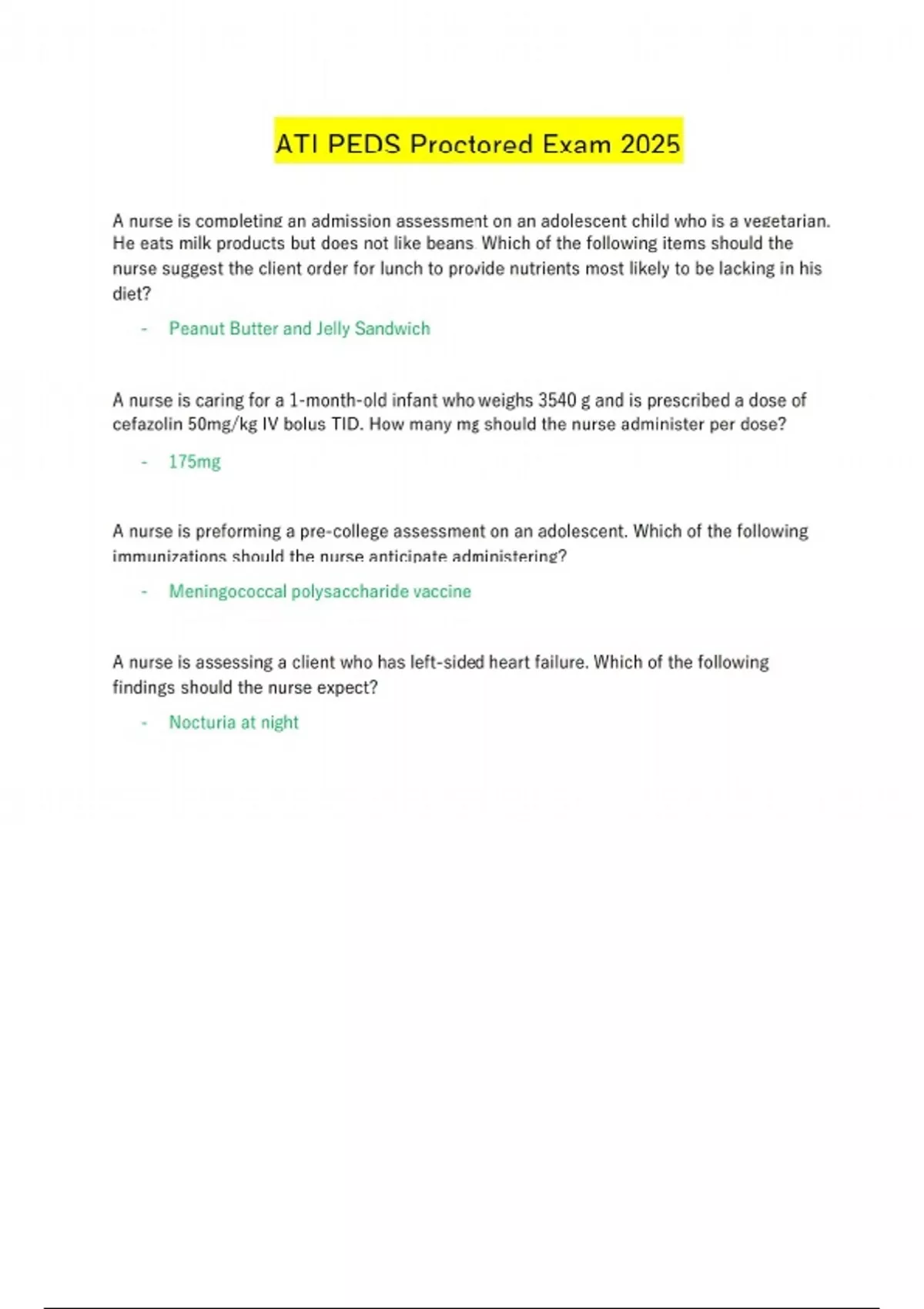 ATI PEDS Proctored Exam 2025 A nurse is caring for a client who has active TB and is to be started on IV rifampin therapy. The nurse should instruct the client that this medication can cause which of the following adverse effects? - Body sections turning a red orange color A nurse is caring for a 6-week-old infant who as a pyloric stenosis. Which of the following manifestations should the nurse expect? - Projectile vomiting A nurse receives a call from a parent of a child who has von Willebrand disease and has having a nosebleed. Which of the following instructions should the nurse give to the parents? - "Have your child sit with her head tilted forward and hold pressure on her nose for 10 minutes." A nurse is assessing a child who is in sickle cell crisis. Which of the following findings should the nurse expect? - Pain A nurse is providing preoperative teaching by demonstrating diaphragmatic breathing to a client who is scheduled for surgery in the morning. Which of the following actions should the nurse include in the demonstration? - Place her hands on the sides of her rib cage