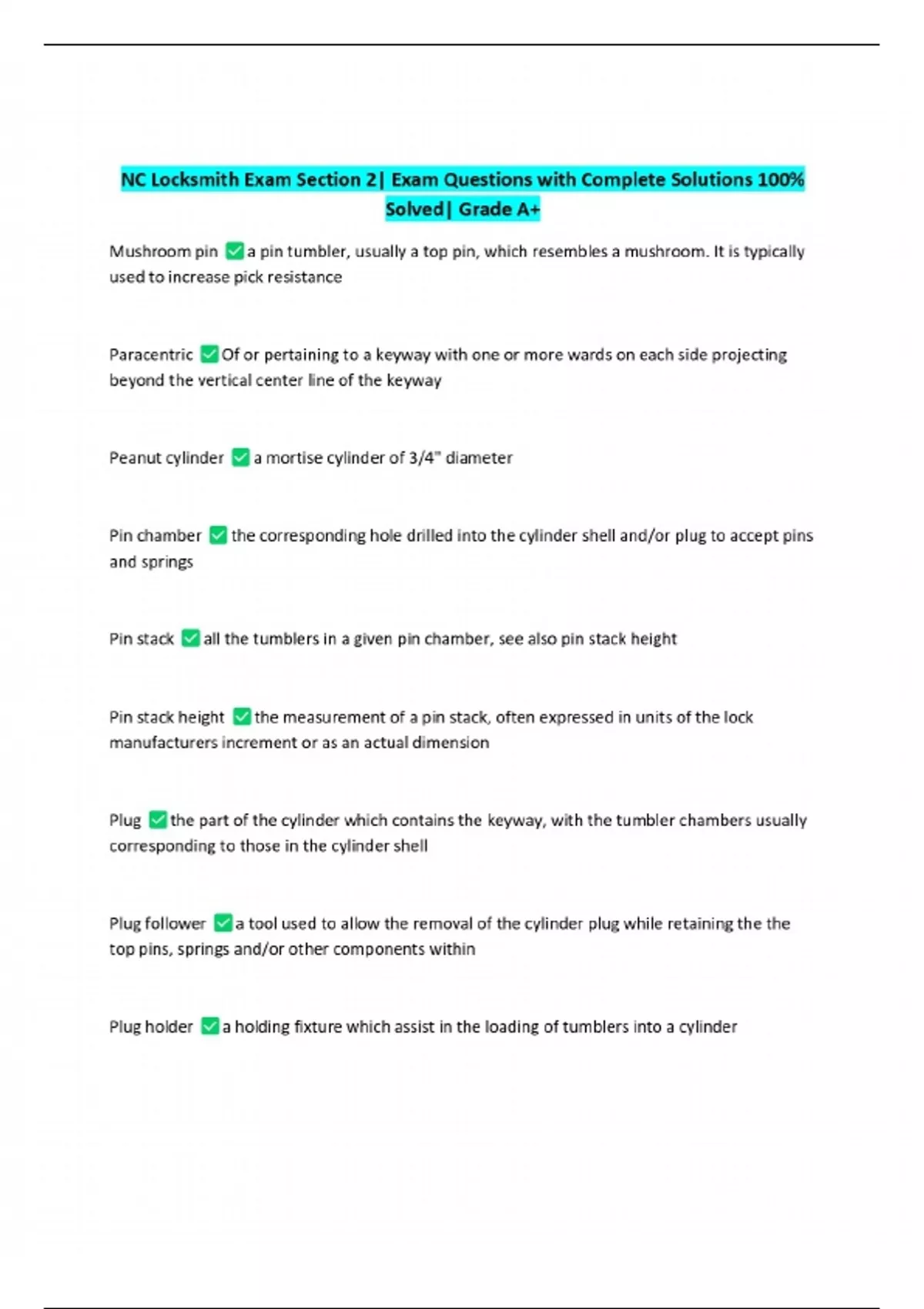 NC Locksmith Exam Section 2| Exam Questions with Complete Solutions 100% Solved| Grade A+