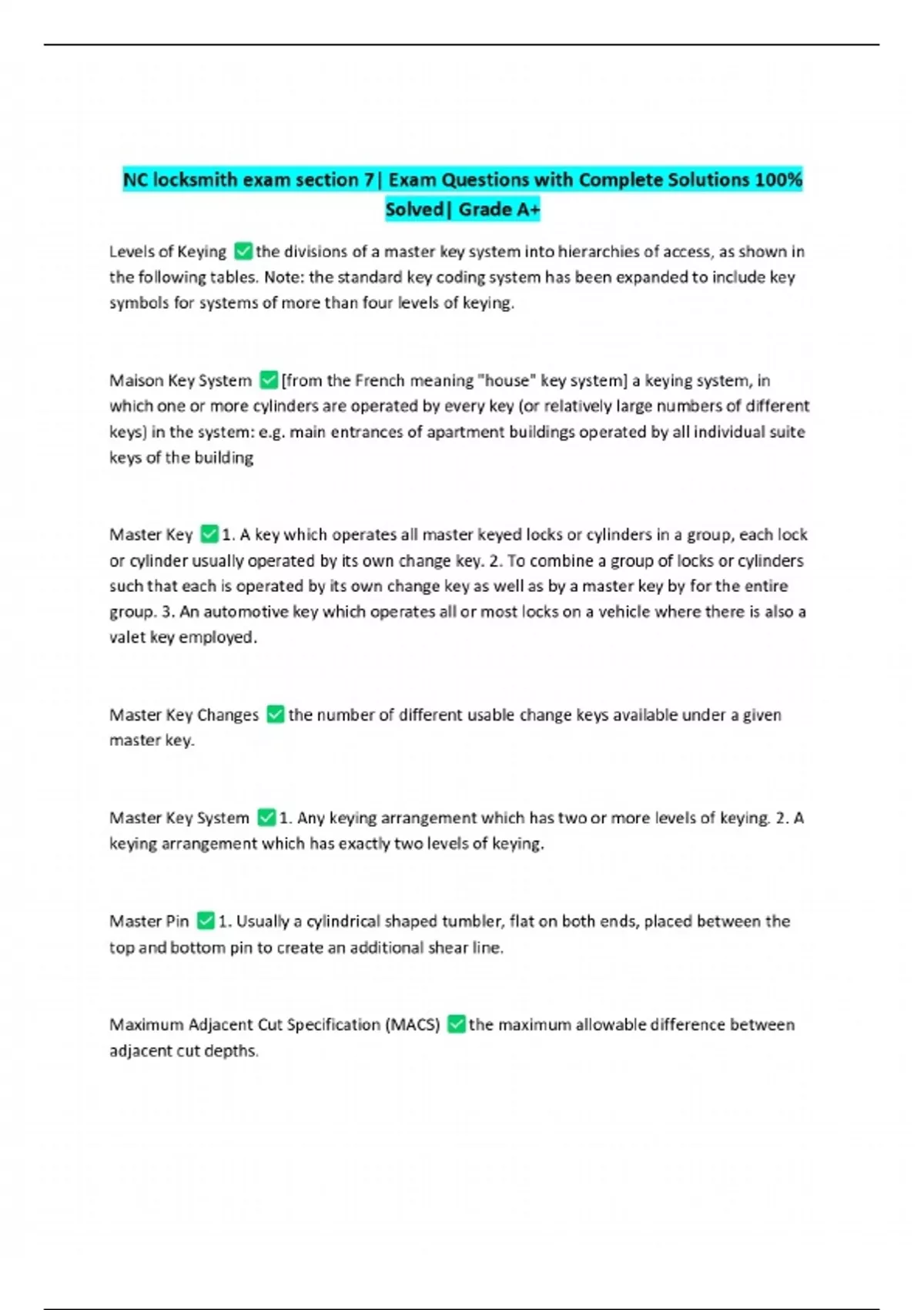 NC locksmith exam section 7| Exam Questions with Complete Solutions 100% Solved| Grade A+