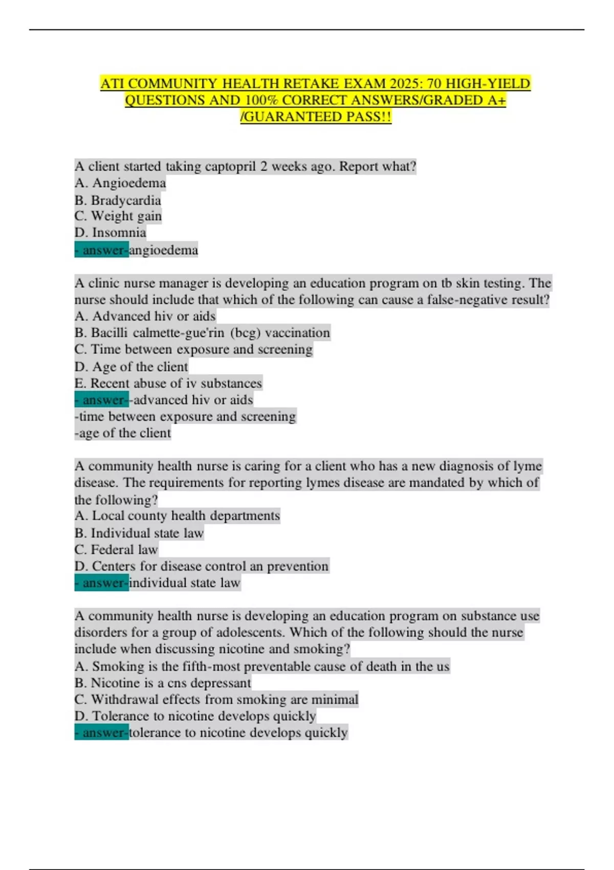 ATI Community Health RETAKE EXAM 2025: 70 High-Yield Questions & 100% Correct Answers (Graded A+)