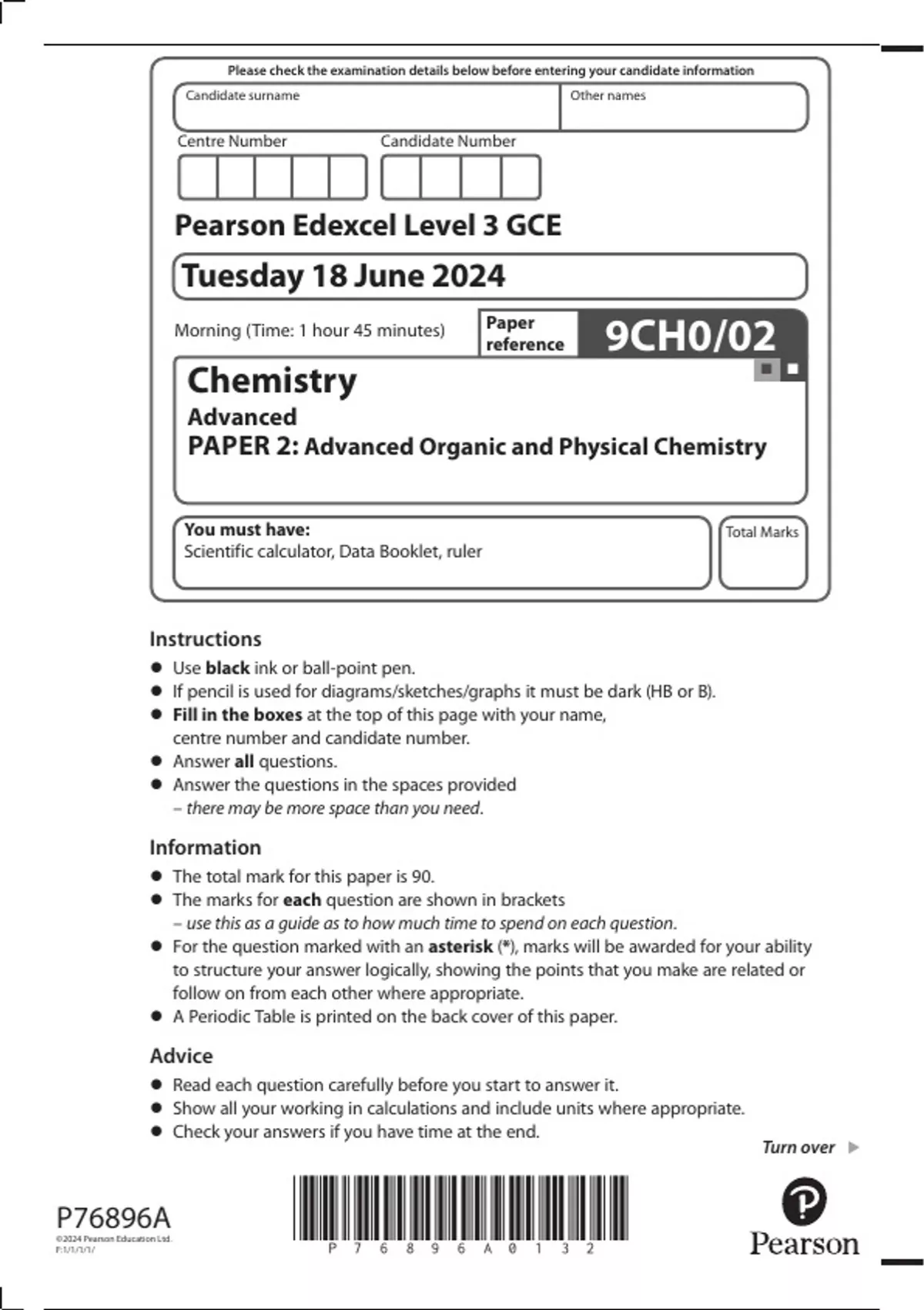Pearson Edexcel Level 3 GCE. Chemistry Advanced 9CH0/02: PAPER 2: Advanced Organic and Physical Chemistry (Summer 2024)