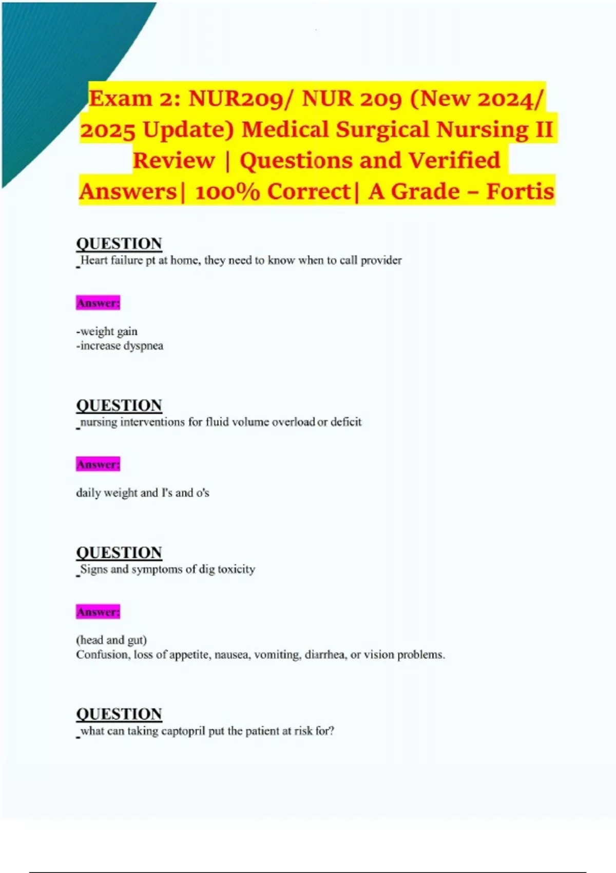 Exam 2- NUR209 (New ) Medical Surgical Nursing 2 Review Questions and Verified Answers 100% Correct Graded A+ Fortis