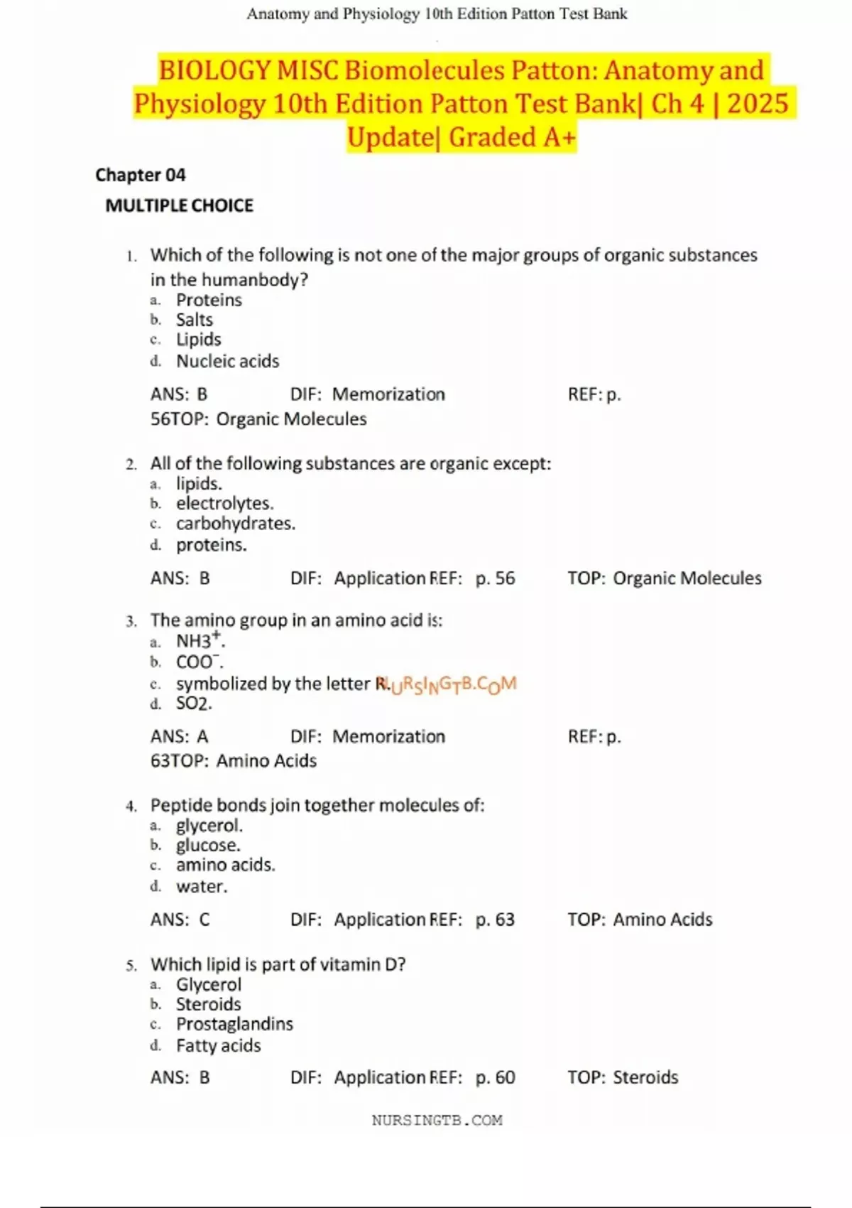 BIOLOGY MISC Biomolecules Patton- Anatomy and Physiology 10th Edition Patton Test Bank. Ch 4 2025 Update Graded A+