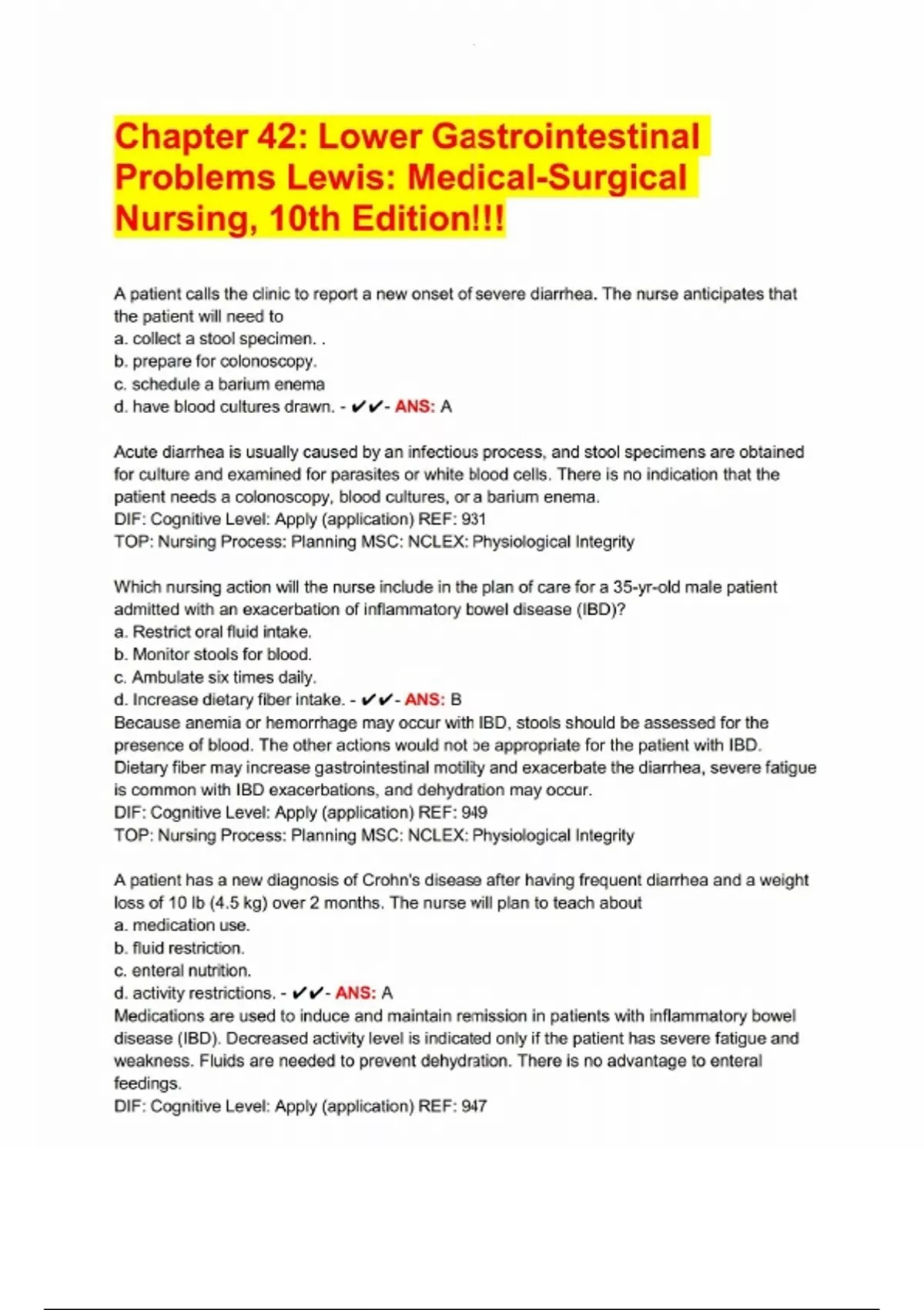 Chapter 42- Lower Gastrointestinal Problems Lewis- Medical-Surgical Nursing, 10th Edition!!