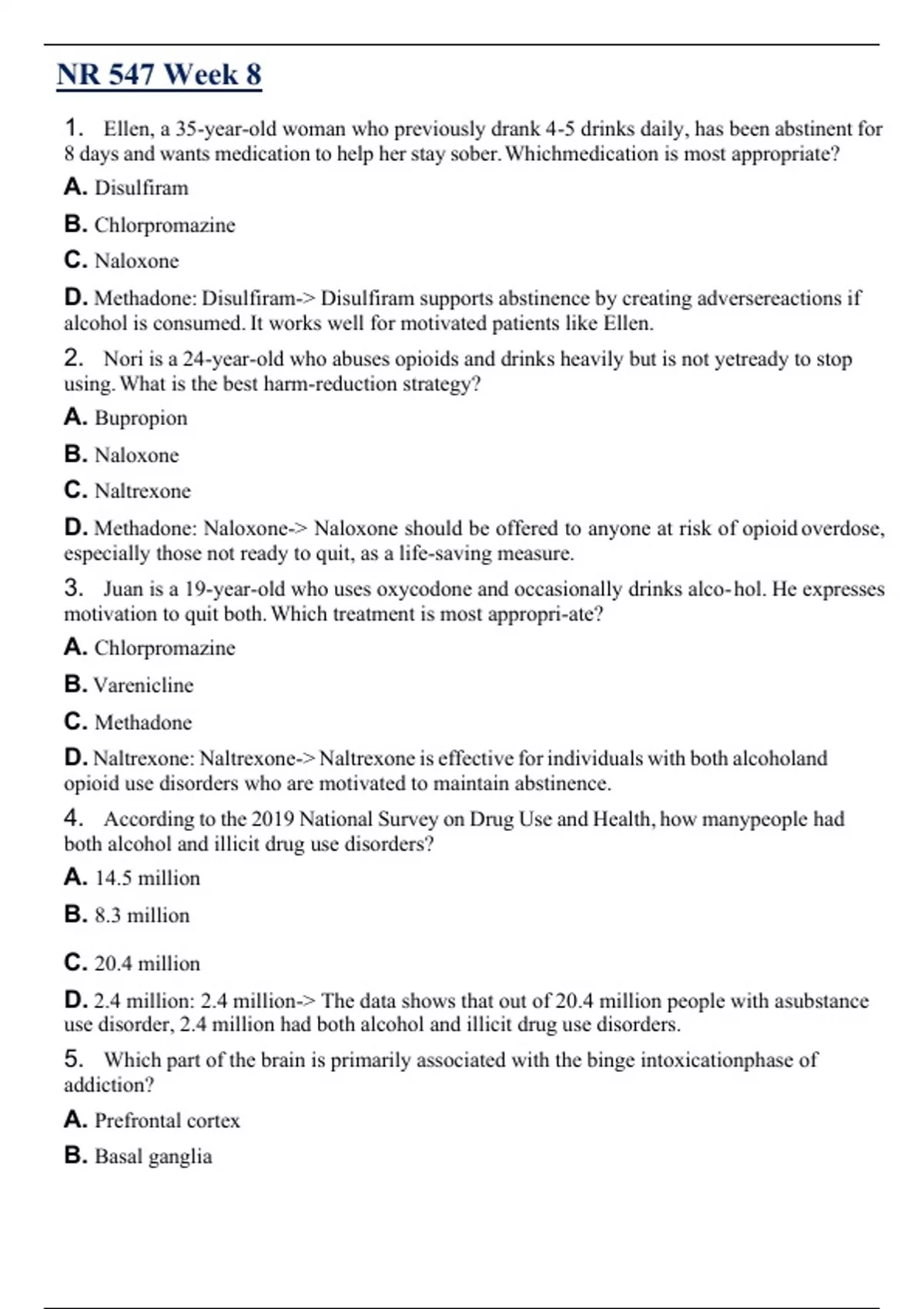 1. Ellen, a 35-year-old woman who previously drank 4-5 drinks daily, has been abstinent for