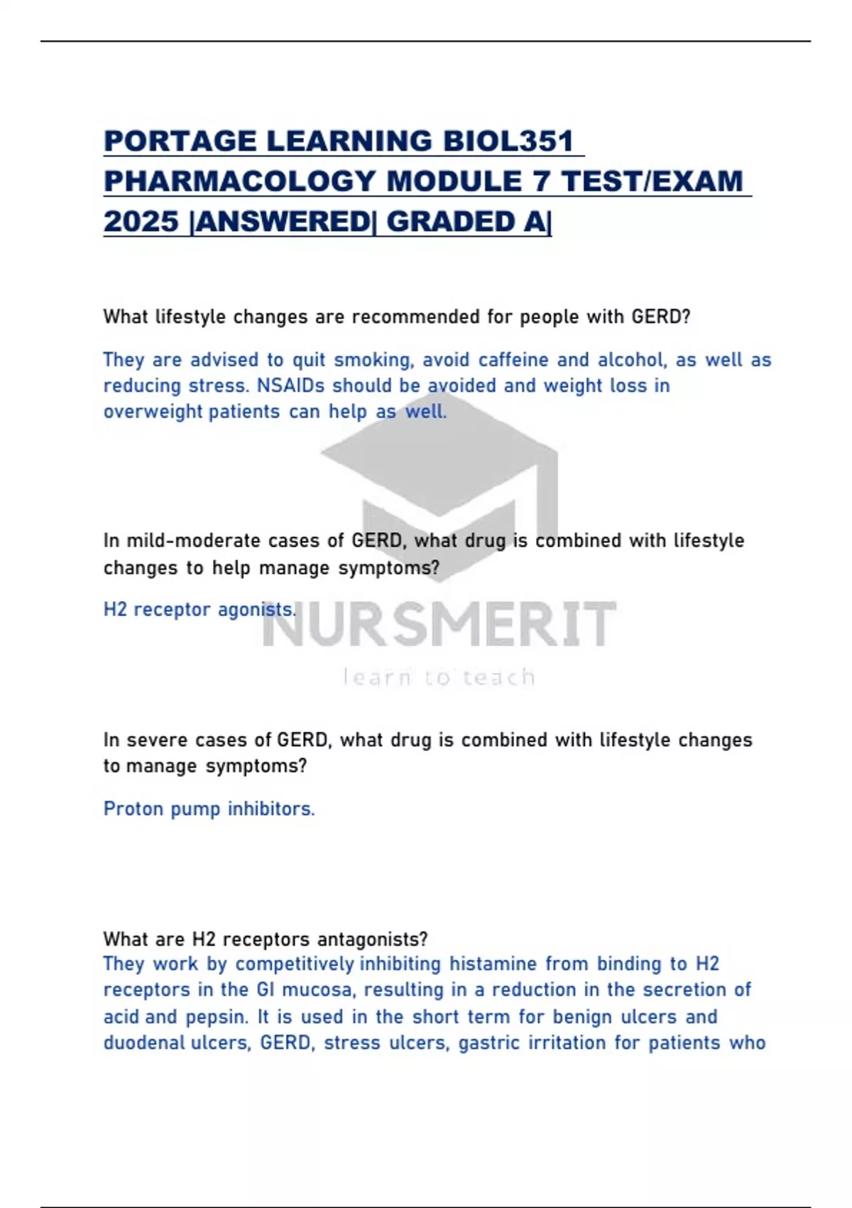 PORTAGE LEARNING BIOL351 PHARMACOLOGY MODULE 7 TEST/EXAM 2025 |ANSWERED| GRADED A|