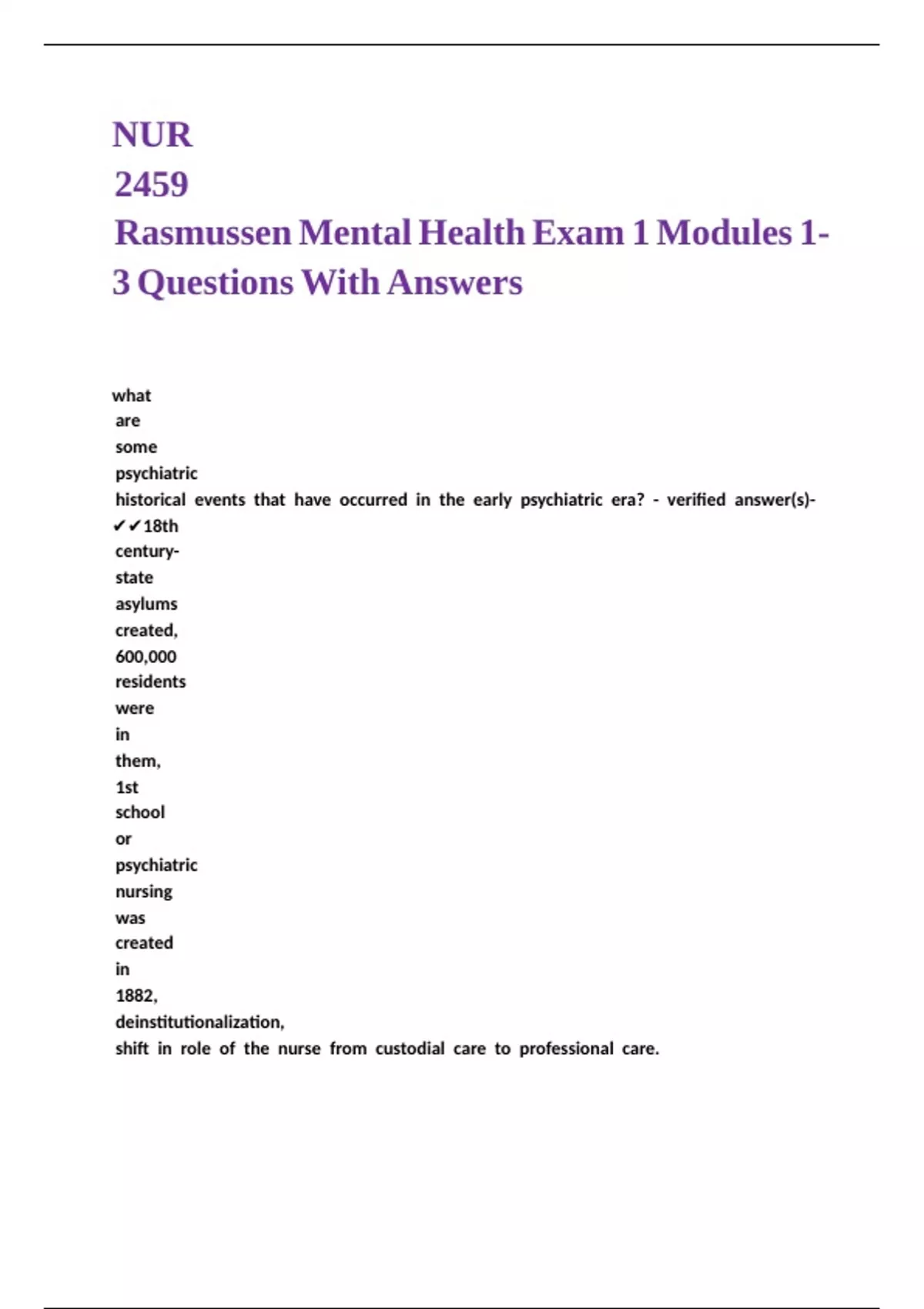 NUR 2459 Rasmussen Mental Health Exam 1 Modules 1-3 Questions With Answers