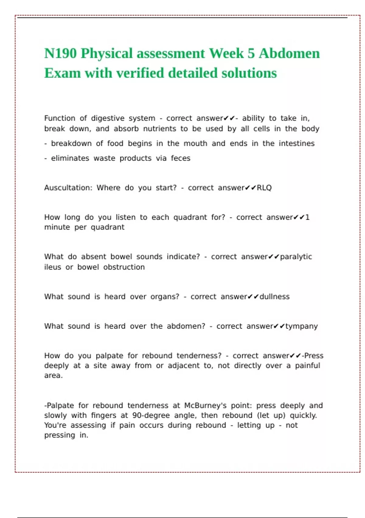 N190 Physical assessment Week 5 Abdomen Exam with verified detailed solutions