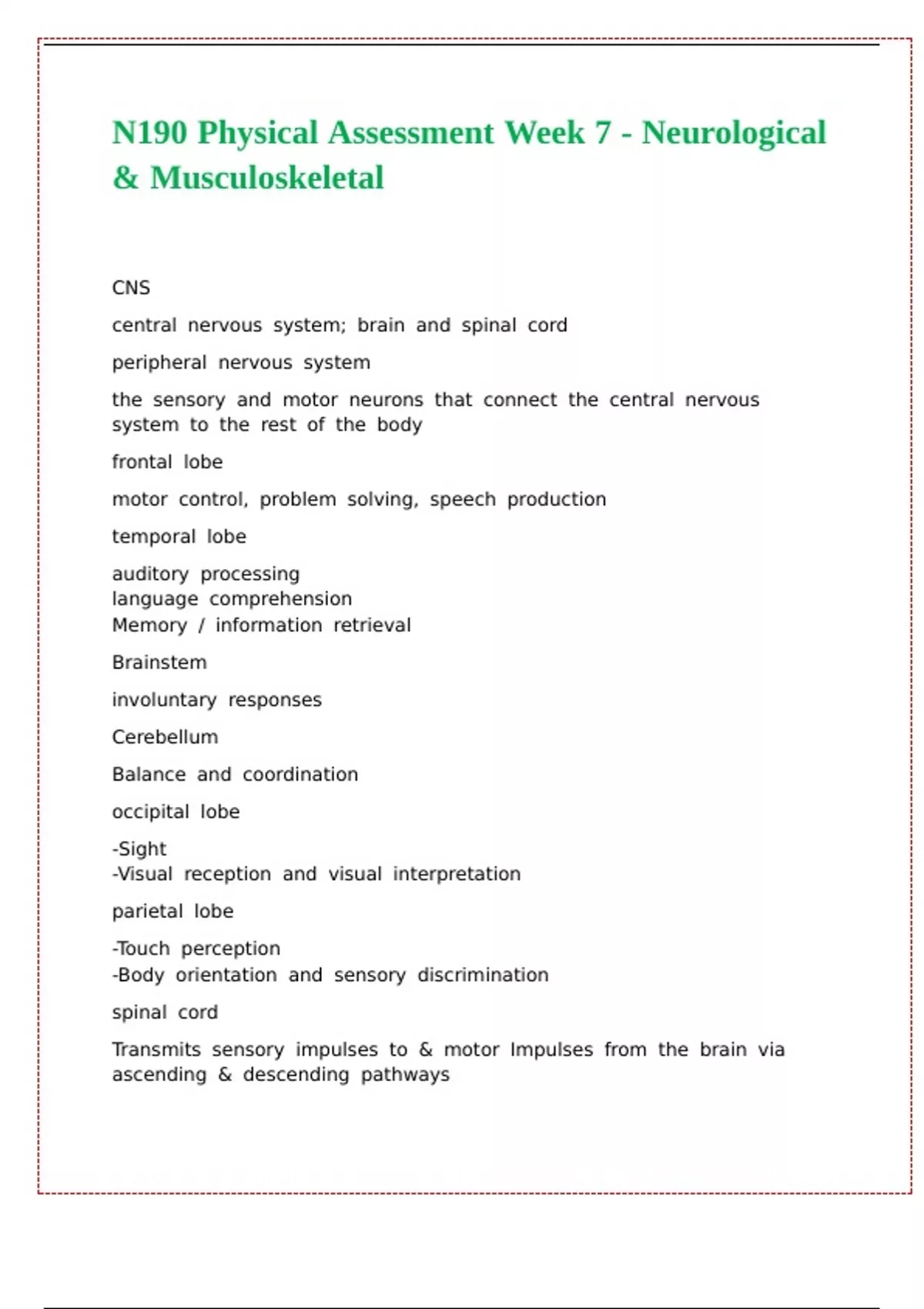 N190 Physical Assessment Week 7 - Neurological & Musculoskeletal