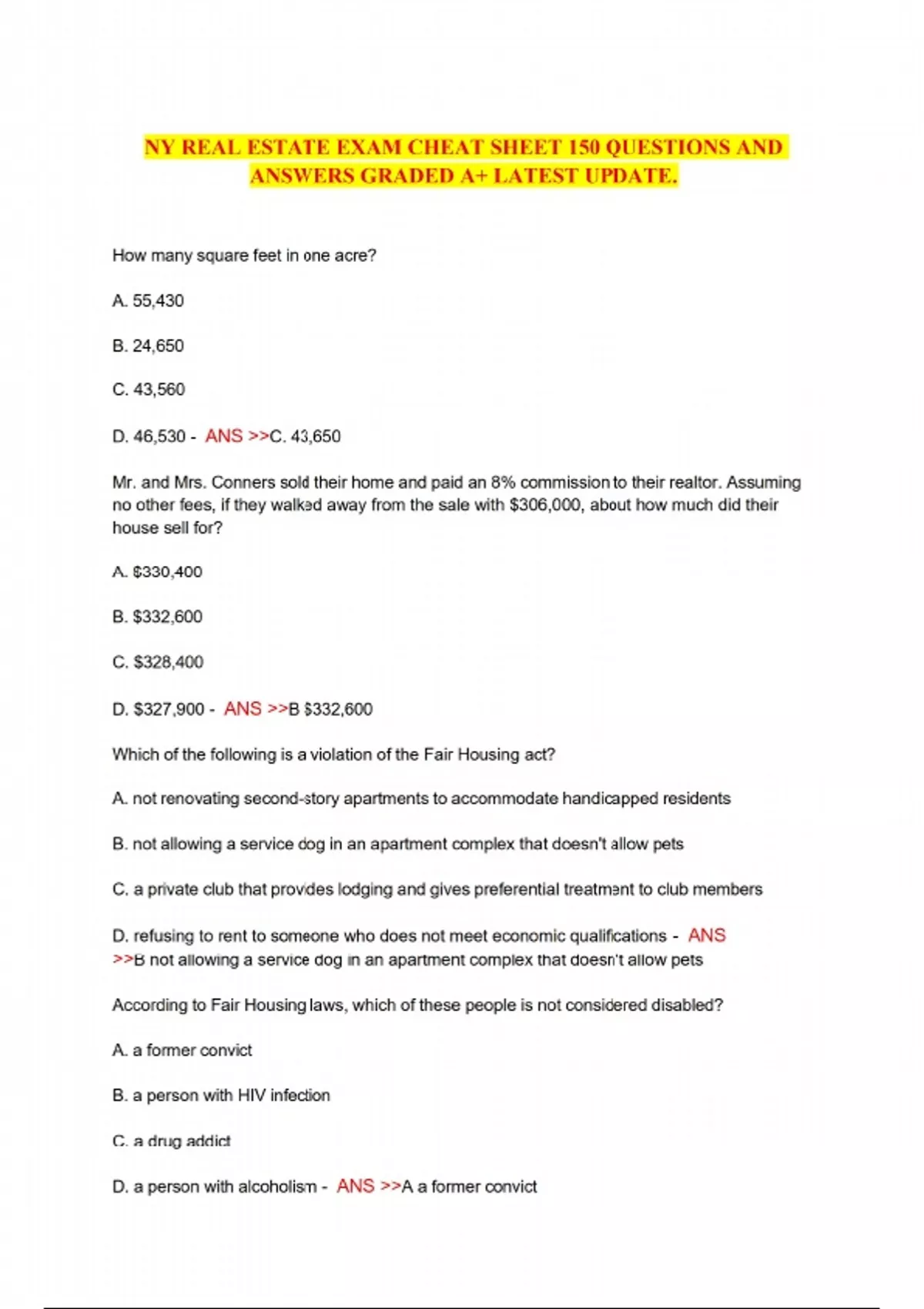 NY REAL ESTATE EXAM CHEAT SHEET 150 QUESTIONS AND ANSWERS GRADED A+ LATEST UPDATE. NY real estate exam cheat sheet real estate exam answers New York 150 real estate questions NY latest real estate exam questions 2025 NY graded A+ real estate test NY New York real estate test cheat real estate exam prep NY updated NY real estate Q&A easy pass NY real estate test New York real estate certification exam A+ graded real estate exam NY NY real estate test preparation real estate licensing exam NY cheat 2025 NY real estate exam guide real estate exam help New York NY real estate test latest update pass NY real estate exam easily real estate questions and answers NY New York real estate practice exam real estate exam secrets NY comprehensive NY real estate Q&A New York State real estate exam effective real estate exam prep New York real estate test strategy NY quick pass NY real estate exam