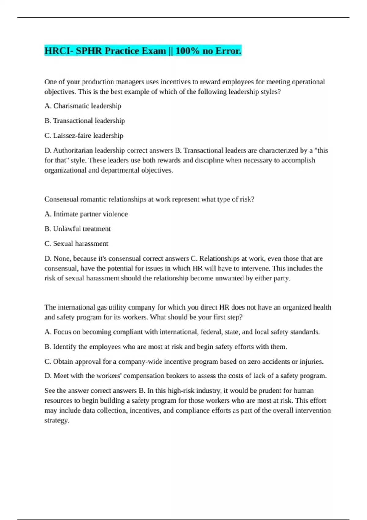 One of your production managers uses incentives to reward employees for meeting operational objectives. This is the best example of which of the following leadership styles? A. Charismatic leadership B. Transactional leadership C. Laissez-faire leadership D. Authoritarian leadership correct answers B. Transactional leaders are characterized by a "this for that" style. These leaders use both rewards and discipline when necessary to accomplish organizational and departmental objectives. Consensual romantic relationships at work represent what type of risk? A. Intimate partner violence B. Unlawful treatment C. Sexual harassment D. None, because it's consensual correct answers C. Relationships at work, even those that are consensual, have the potential for issues in which HR will have to intervene. This includes the risk of sexual harassment should the relationship become unwanted by either party. The international gas utility company for which you direct HR does not have an organized health and safety program for its workers. What should be your first step? A. Focus on becoming compliant with international, federal, state, and local safety standards. B. Identify the employees who are most at risk and begin safety efforts with them. C. Obtain approval for a company-wide incentive program based on zero accidents or injuries. D. Meet with the workers' compensation brokers to assess the costs of lack of a safety program. See the answer correct answers B. In this high-risk industry, it would be prudent for human resources to begin building a safety program for those workers who are most at risk. This effort may include data collection, incentives, and compliance efforts as part of the overall intervention strategy.