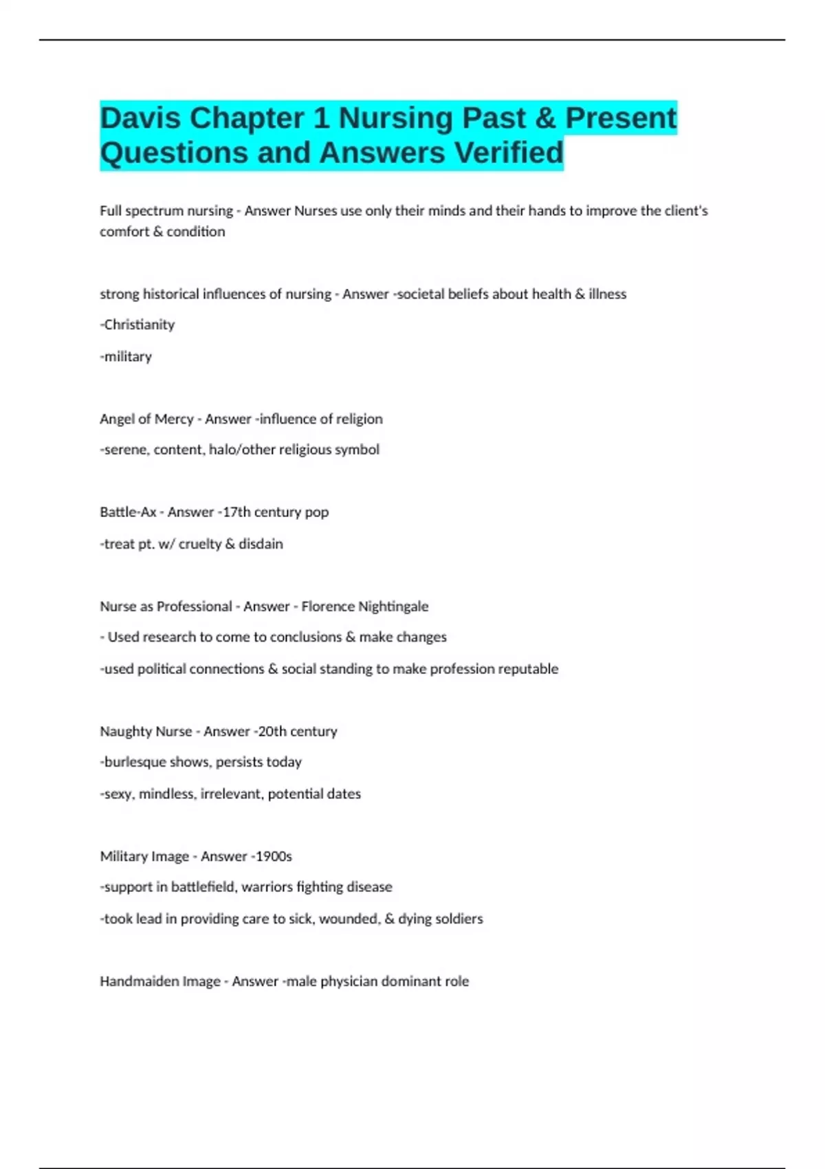 Full spectrum nursing - Answer Nurses use only their minds and their hands to improve the client's comfort & condition strong historical influences of nursing - Answer -societal beliefs about health & illness -Christianity -military Angel of Mercy - Answer -influence of religion -serene, content, halo/other religious symbol Battle-Ax - Answer -17th century pop -treat pt. w/ cruelty & disdain Nurse as Professional - Answer - Florence Nightingale - Used research to come to conclusions & make changes -used political connections & social standing to make profession reputable