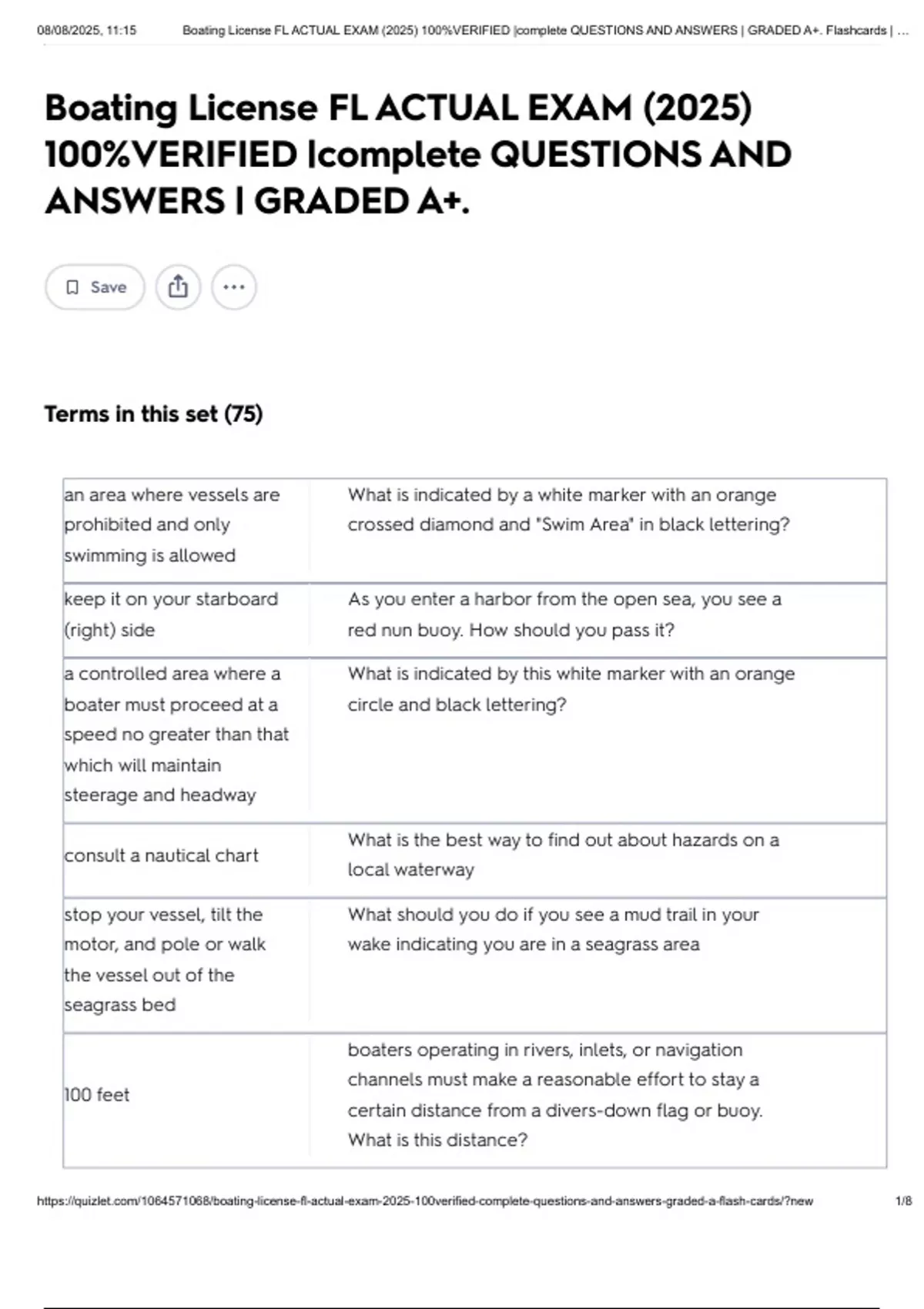 , 08/08/2025, 11:15 Boating License FL ACTUAL EXAM (2025) 100%VERIFIED |complete QUESTIONS AND ANSWERS | GRADED A+. Flashcards | …