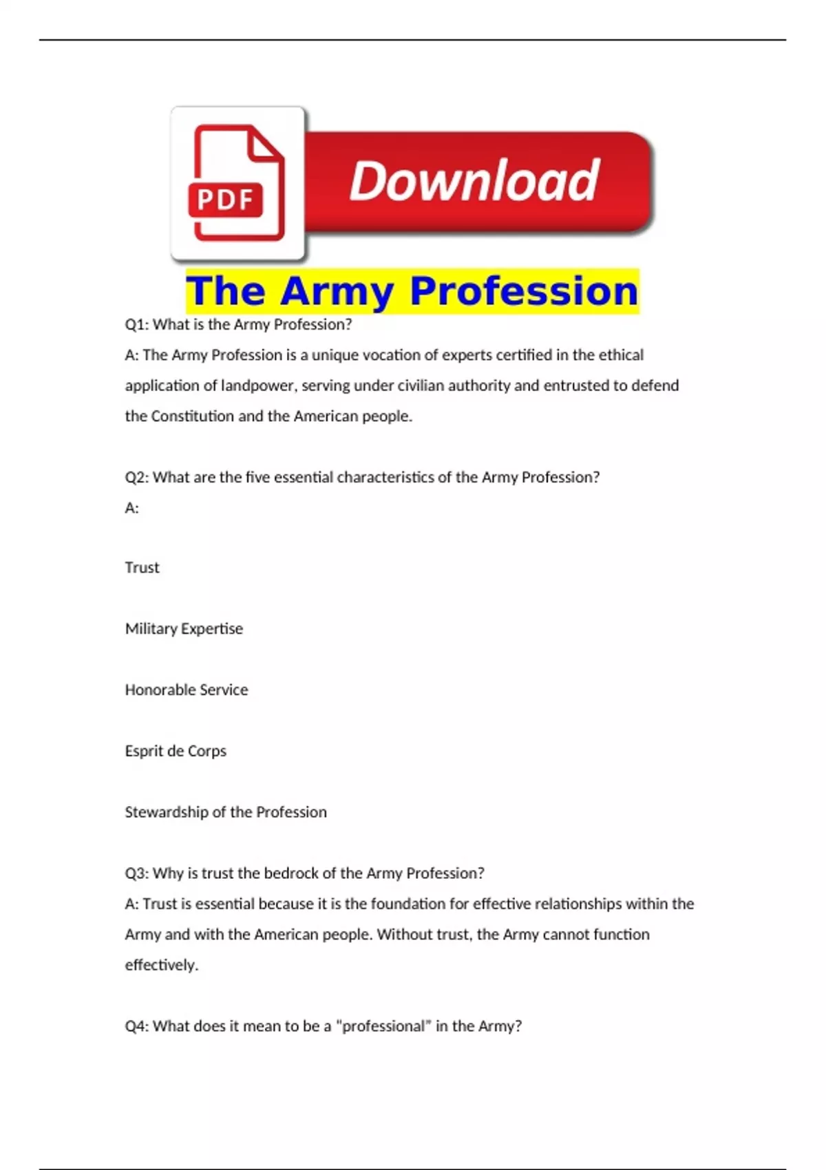 The Army Profession: Questions and Answers (CORRECT 100%) accurate answers, a test with perfect scores.Graded A+