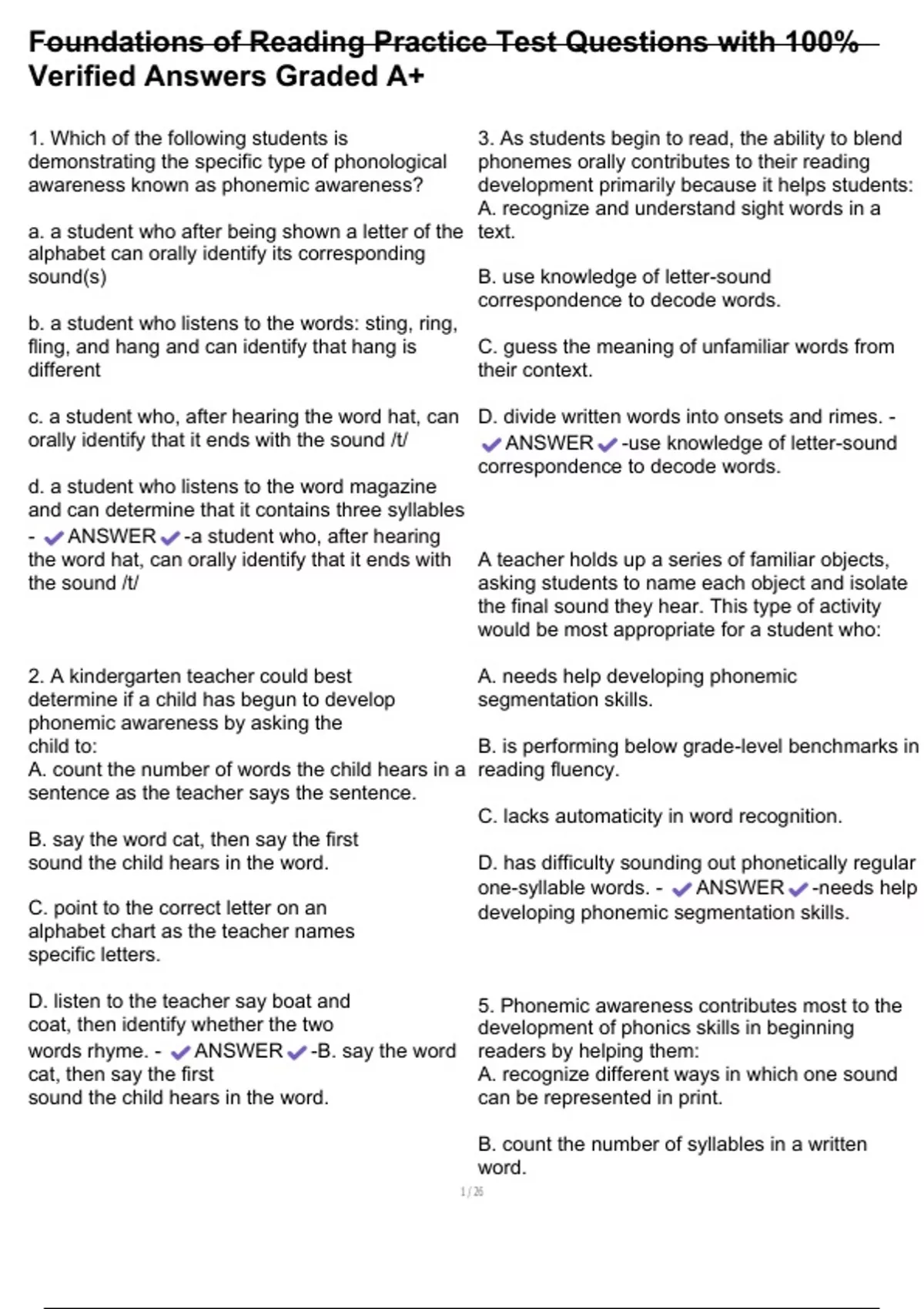 ,Foundations of Reading Practice Test Questions with 100%