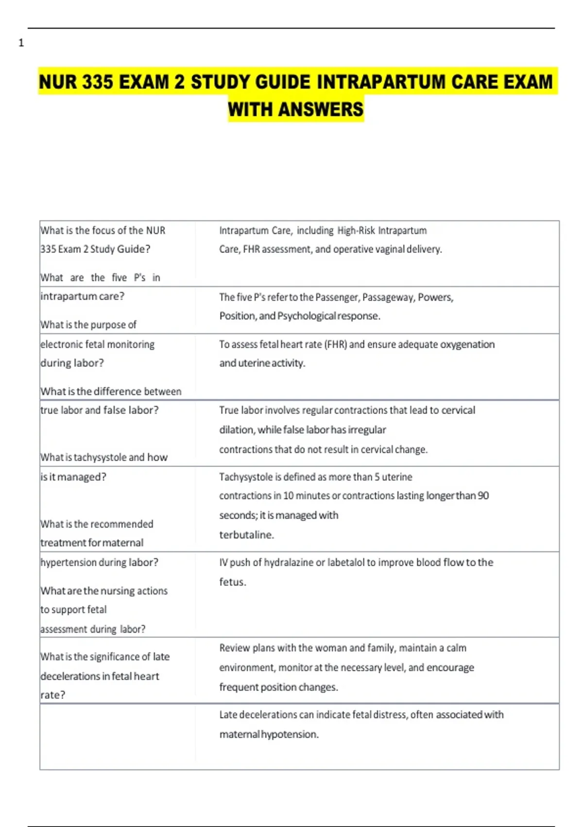 NUR 335 EXAM 2 STUDY GUIDE INTRAPARTUM CARE EXAM