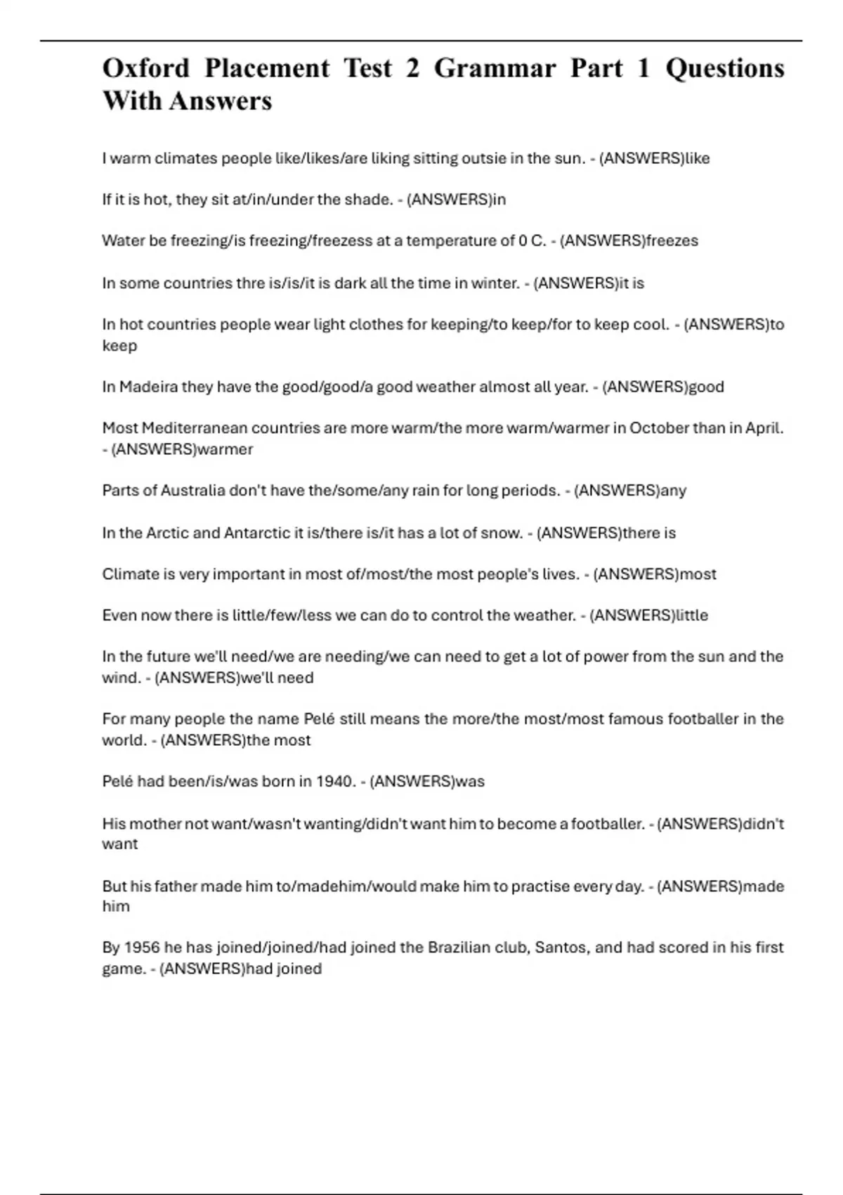 Oxford Placement Test 2 Grammar Part 1 Questions