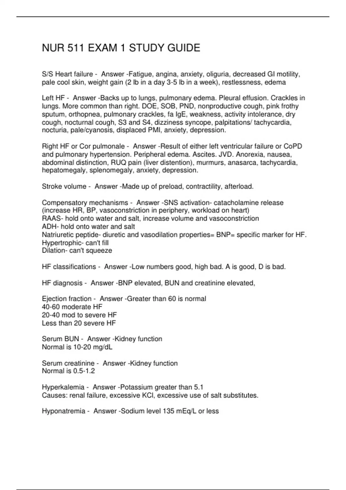 S/S Heart failure - Answer -Fatigue, angina, anxiety, oliguria, decreased GI motility,