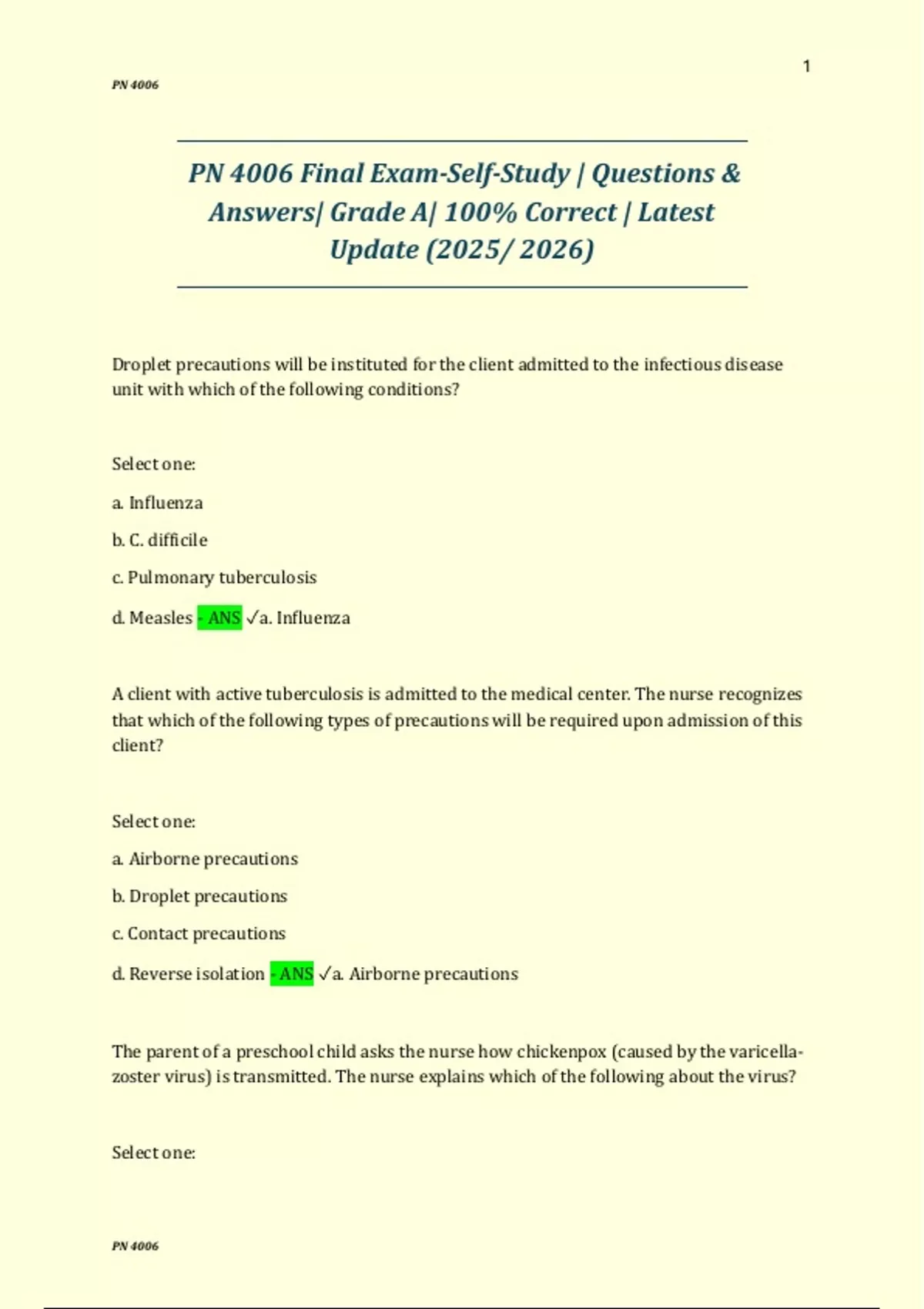 d. Reverse isolation - ANS ✓a. Airborne precautions