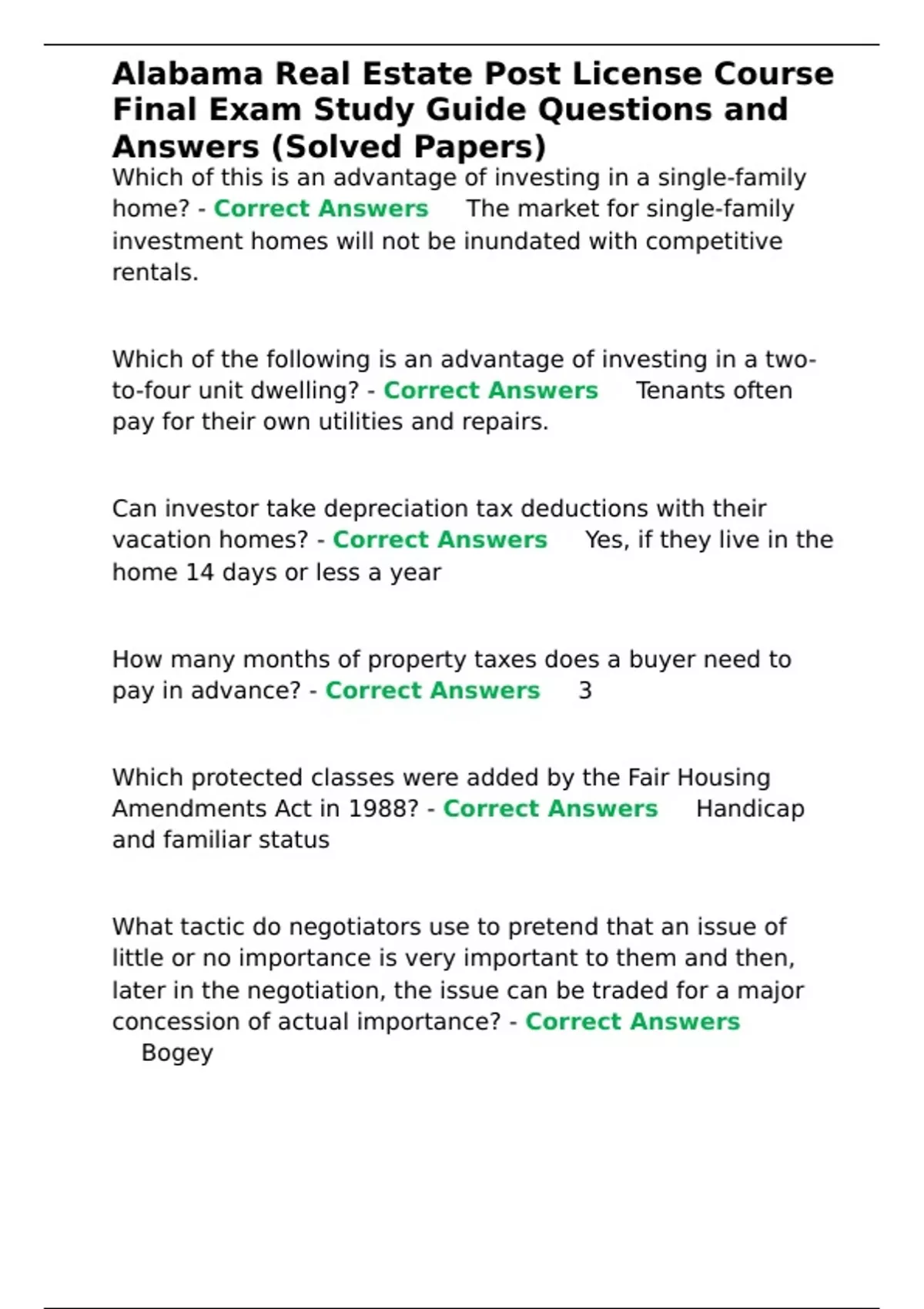 Alabama Real Estate Post License Course Final Exam Study Guide Questions and Answers (Solved