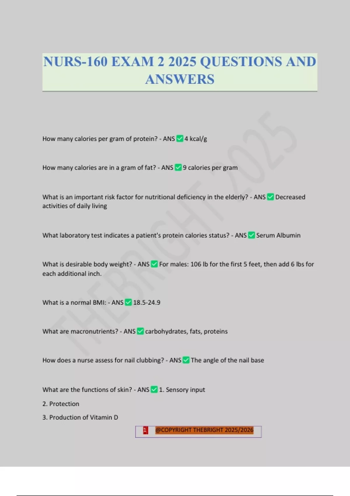 How many calories per gram of protein? - ANS 4 kcal/g How many calories are in a gram of fat? - ANS 9 calories per gram What is an important risk factor for nutritional deficiency in the elderly? - ANS Decreased activities of daily living What laboratory test indicates a patient's protein calories status? - ANS Serum Albumin What is desirable body weight? - ANS For males: 106 lb for the first 5 feet, then add 6 lbs for each additional inch. What is a normal BMI: - ANS 18.5-24.9 What are macronutrients? - ANS carbohydrates, fats, proteins How does a nurse assess for nail clubbing? - ANS The angle of the nail base What are the functions of skin? - ANS 1. Sensory input 2. Protection 3. Production of Vitamin D NURS-160 EXAM 2 2025 QUESTIONS AND ANSWERS 2 @COPYRIGHT THEBRIGHT 2025/2026 4. Temperature regulation What would the nurse include as the most common cause of skin lesions for this age group? - ANS Communicable disease and bacterial infection What does the confrontation test assess? - ANS peripheral vision What signs of cyanosis does a nurse inspect for in a dark-skinned patient? - ANS Ashen-gray color of the oral mucous membranes What is the greatest physical variation of ears among individuals of different races? - ANS Consistency and color of cerumen What are macules? - ANS freckles How to assess for skin turgor? - ANS Pinching the skin and watch the skin return to place Where are bronchovesicular sounds heard? - ANS Over the major bronchi: between the scapulae, around the upper sternum in the first and second ICS The nurse assesses a patient who has a costal angle greater than 90 degrees. What is the most likely cause of this finding? - ANS COPD Which assessment procedure is most pertinent to collecting data? - ANS The first assessment What groups have the