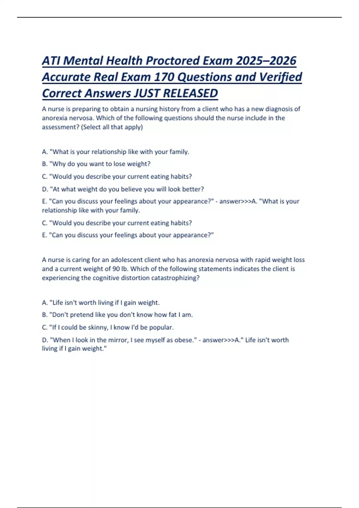 anorexia nervosa. Which of the following questions should the nurse include in the
