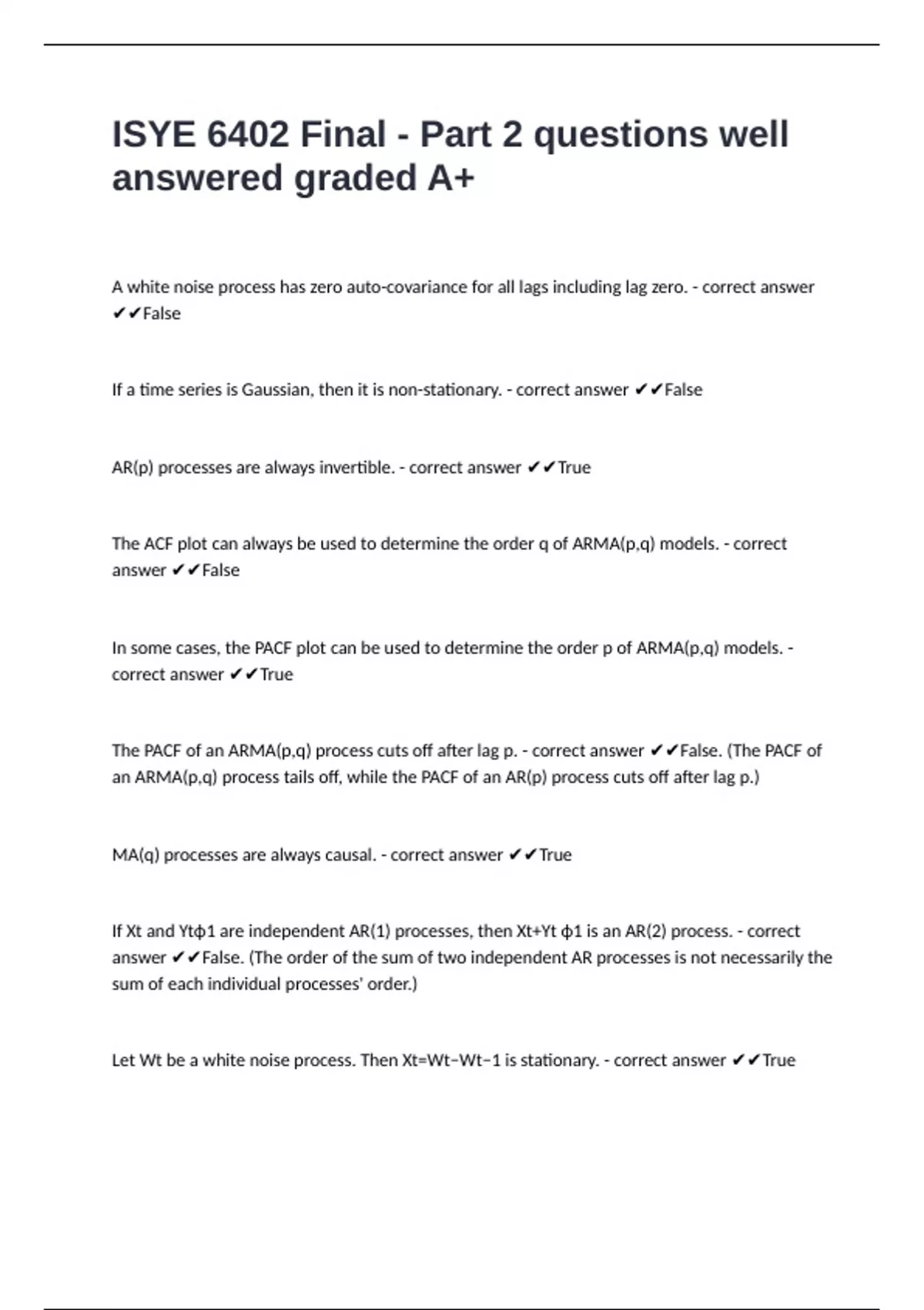 MA(q) processes are always causal. - correct answer ✔✔True