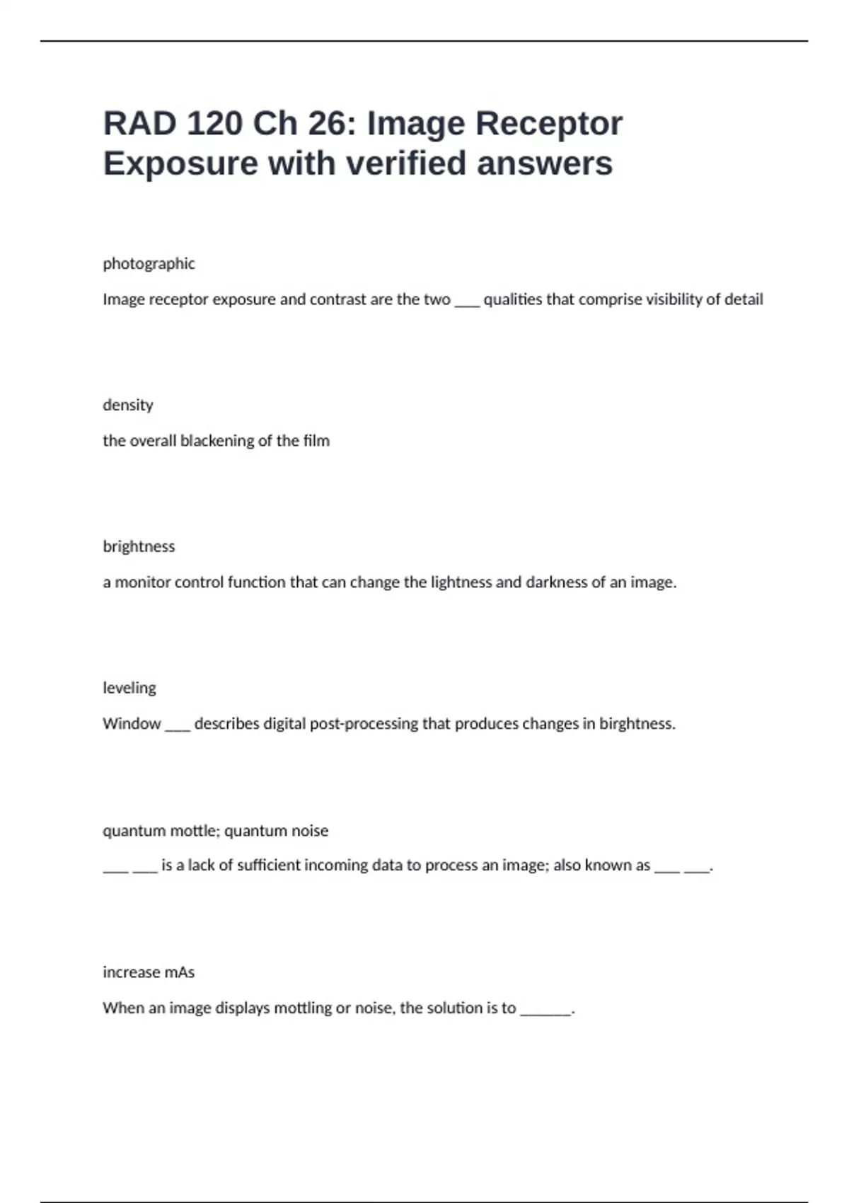 RAD 120 Ch 26: Image Receptor Exposure with verified answers
