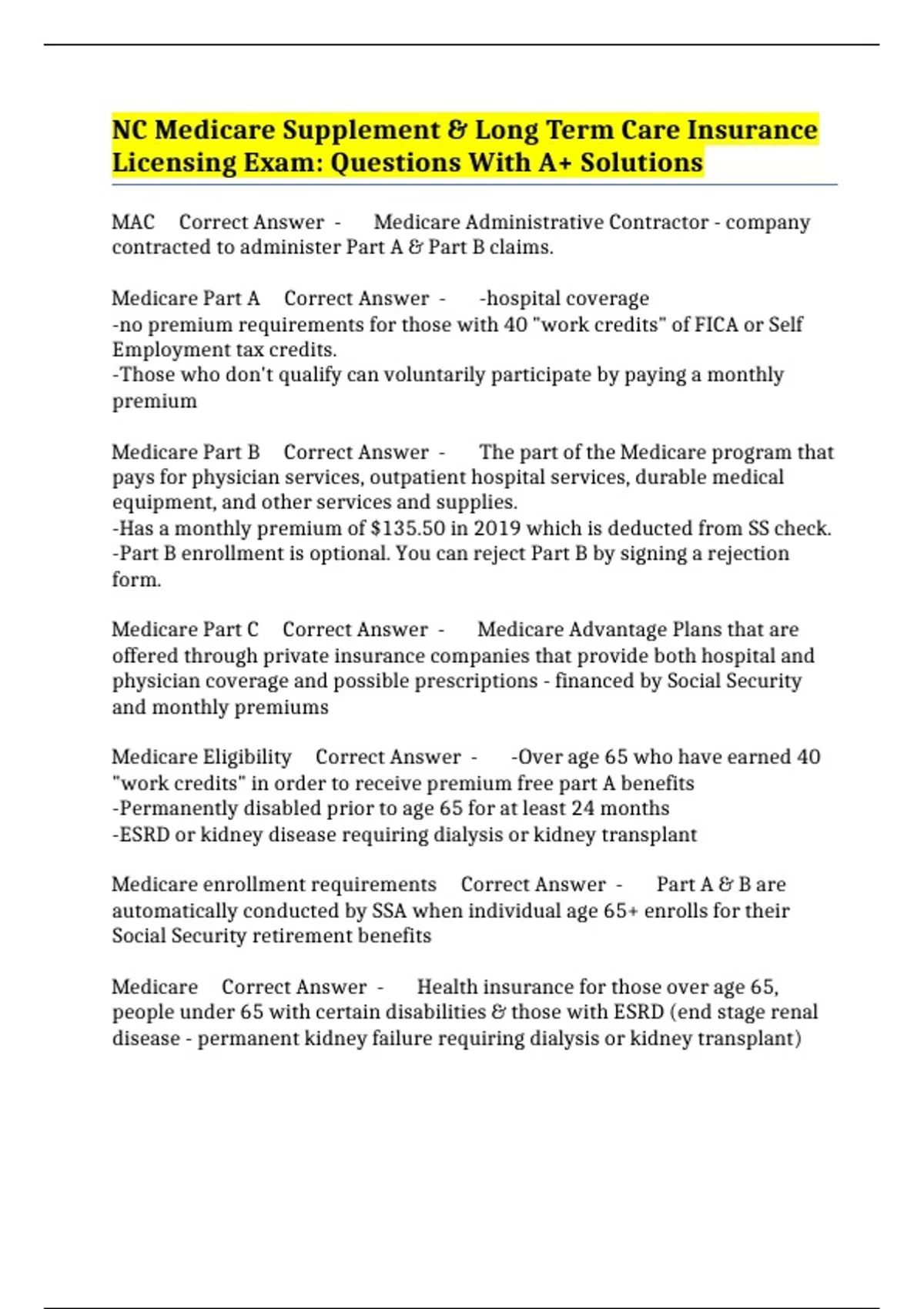 NC Medicare Supplement & Long Term Care Insurance Licensing Exam: Questions With A+ Solutions