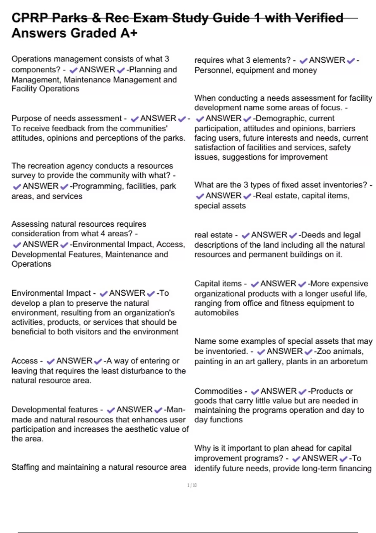 , CPRP Parks & Rec Exam Study Guide 1 with Verified