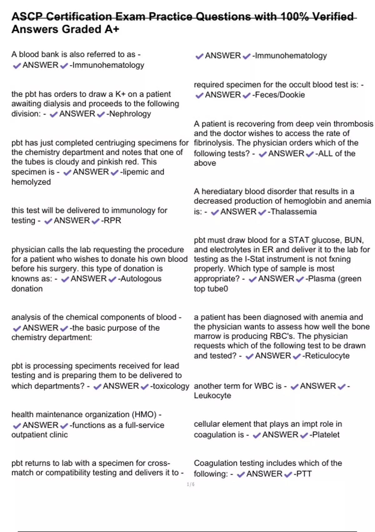 ASCP Certification Exam Practice Questions with 100% Verified Answers Graded A+