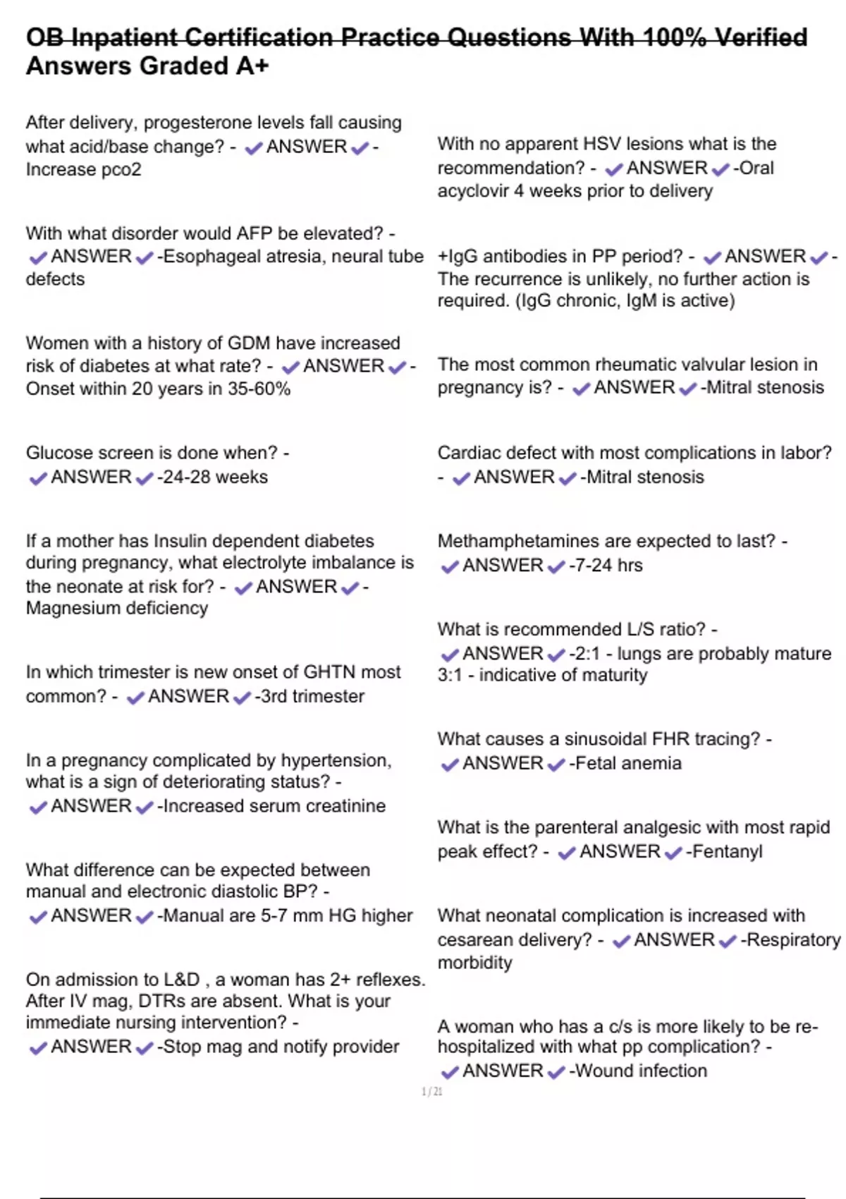 ,OB Inpatient Certification Practice Questions With 100% Verified