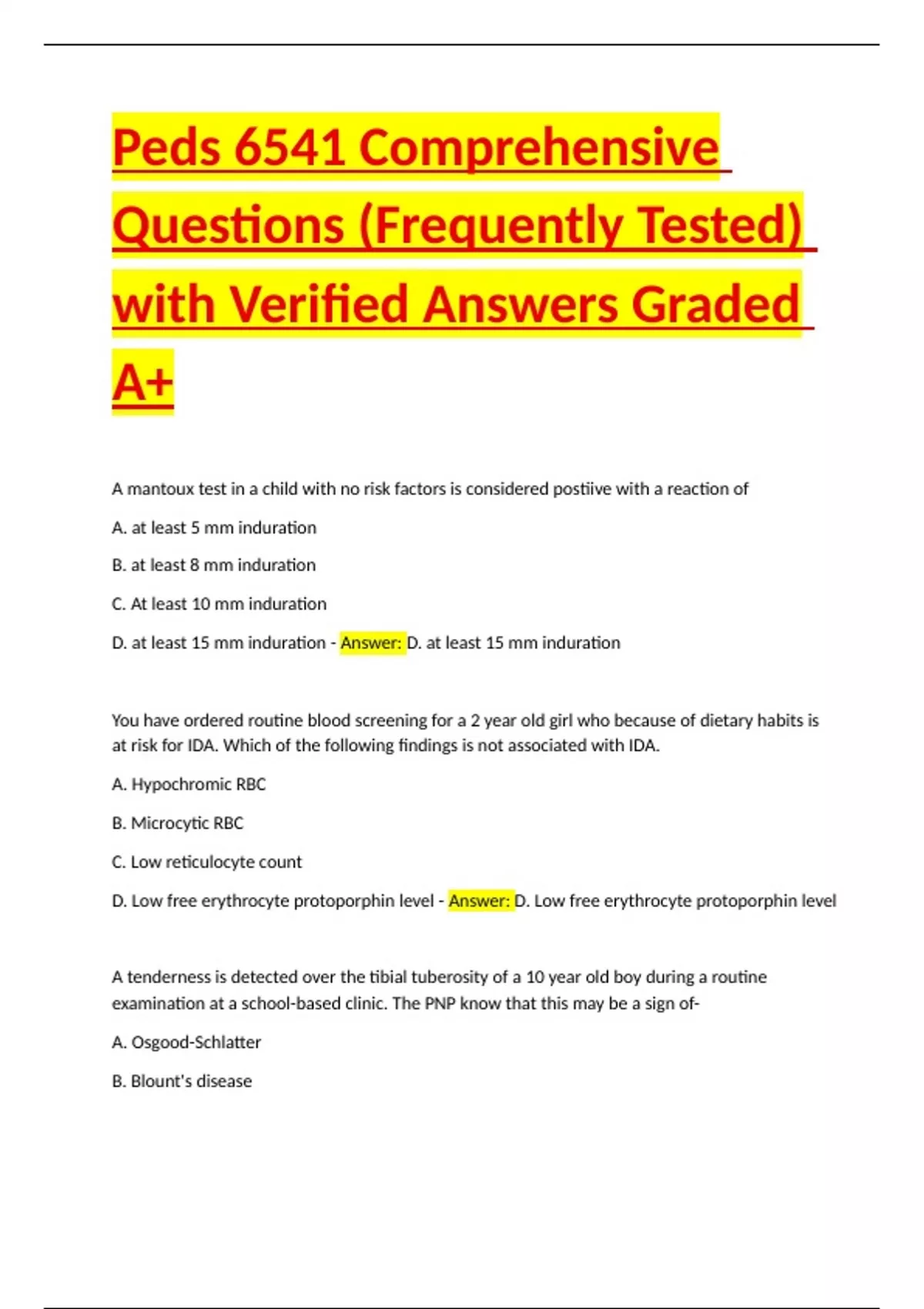 Peds 6541 Comprehensive Questions (Frequently Tested) with Verified Answers Graded A+