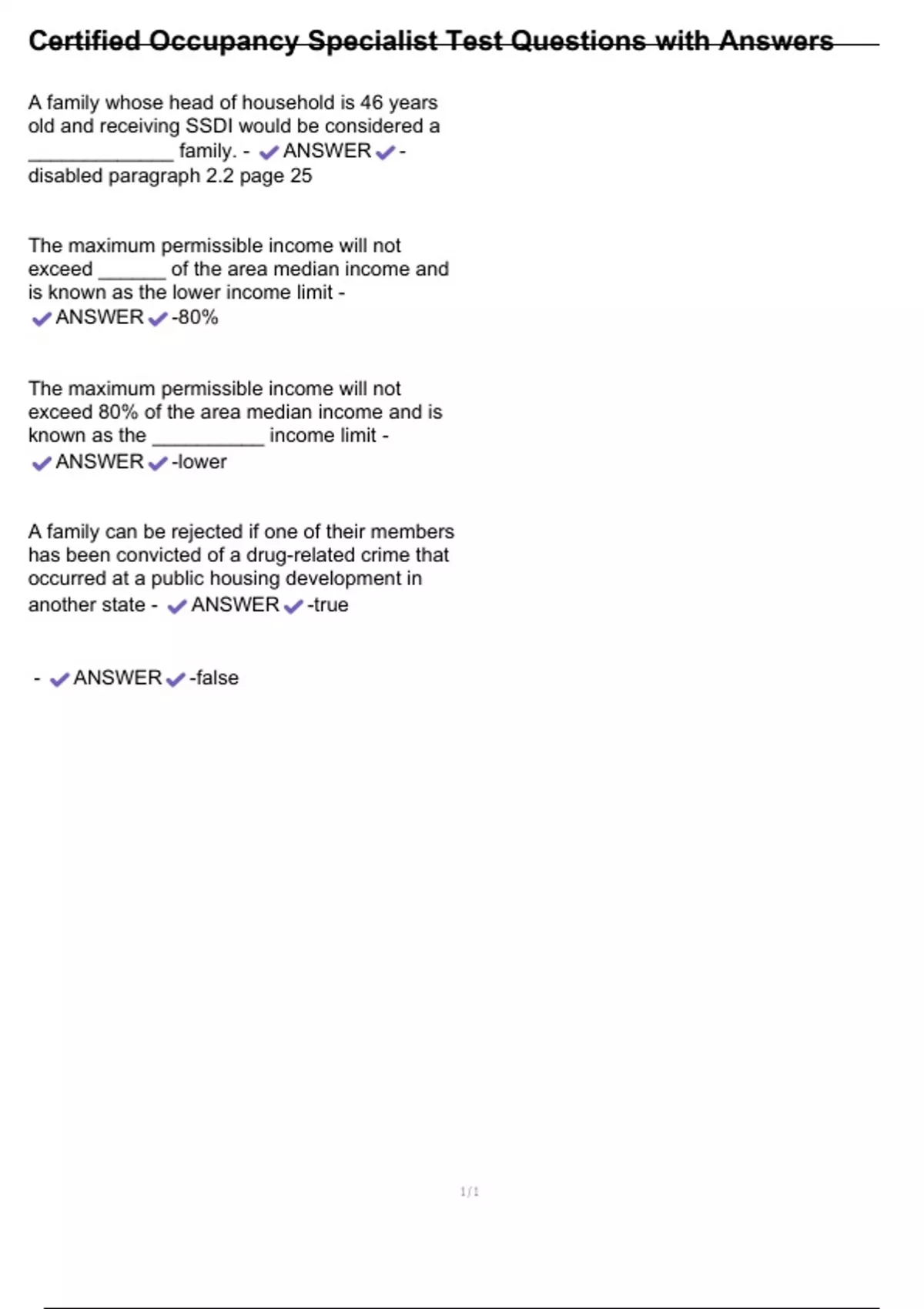 A family whose head of household is 46 years old and receiving SSDI would be considered a _____________ family. - ANSWER - disabled paragraph 2.2 page 25 The maximum permissible income will not exceed ______ of the area median income and is known as the lower income limit - ANSWER