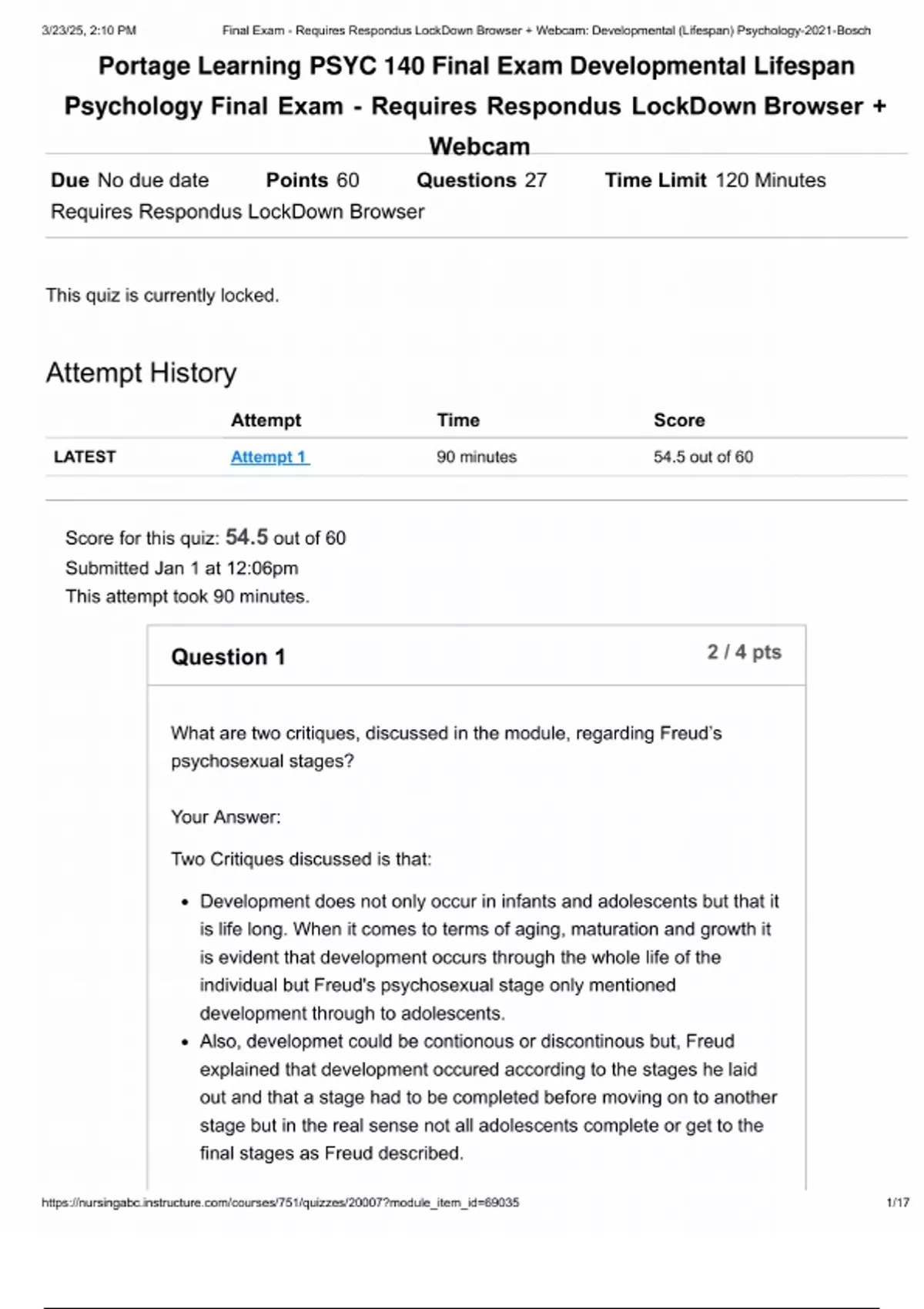 Portage Learning PSYC 140 Final Exam Developmental Lifespan Psychology Final Exam - Requires Respondus LockDown Browser + WebcamScore for this quiz: 54.5 out of 60 Submitted Jan 1 at 12:06pm This attempt took 90 minutes. Question 1 2 / 4 pts Your Answer: What are two critiques, discussed in the module, regarding Freud’s psychosexual stages? Two Critiques discussed is that: Development does not only occur in infants and adolescents but that it is life long. When it comes to terms of aging, maturation and growth it is evident that development occurs through the whole life of the individual but Freud's psychosexual stage only mentioned development through to adolescents. Also, developmet could be c