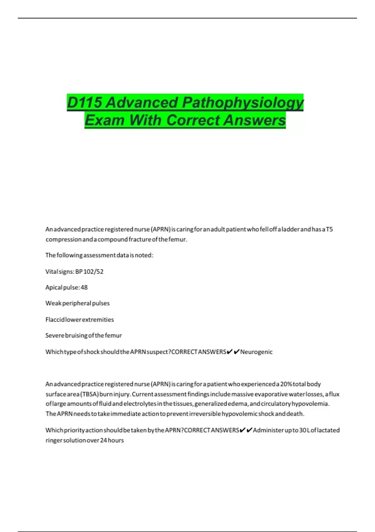 D115 Advanced Pathophysiology Exam With Correct Answers