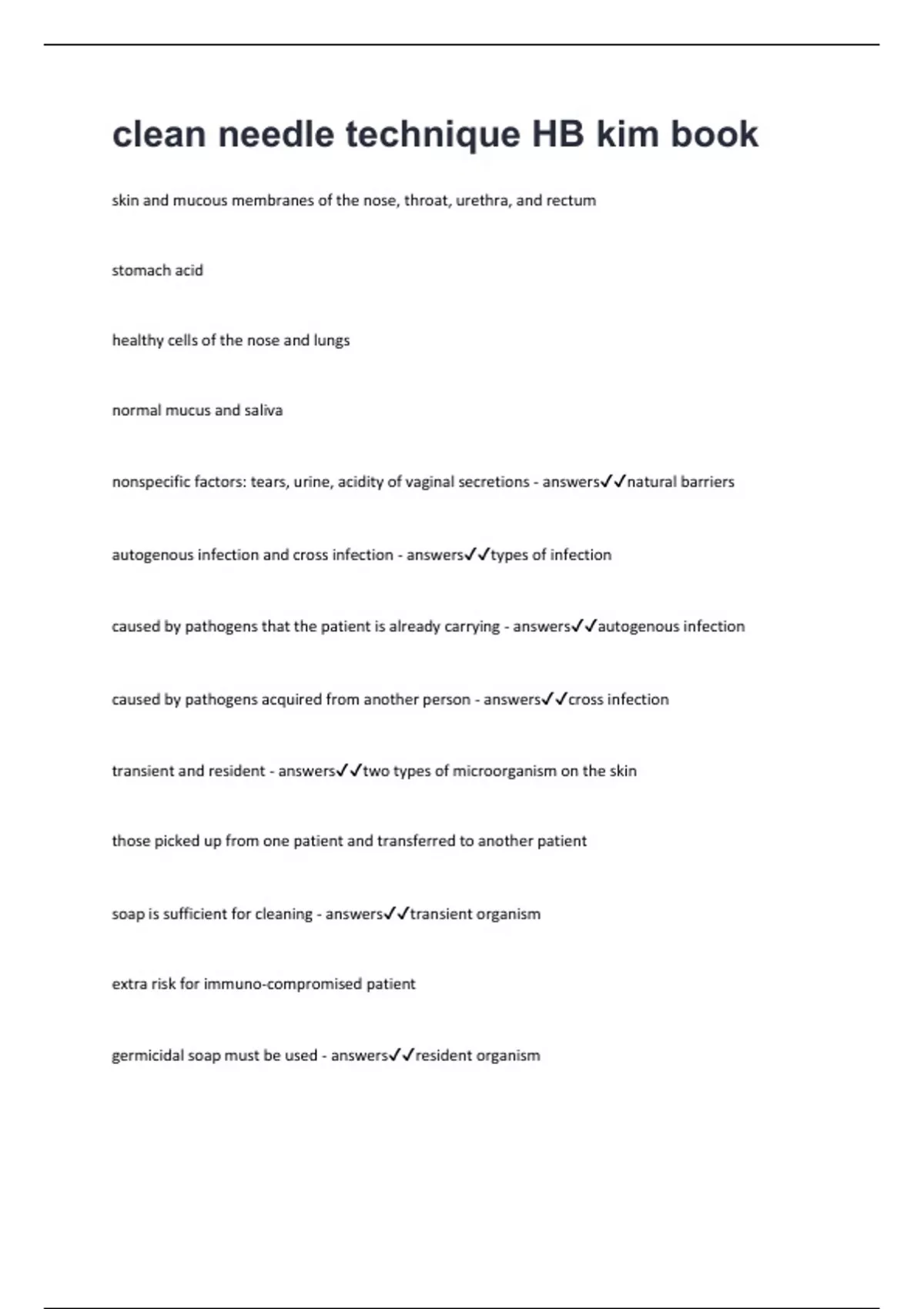 clean needle technique HB kim book skin and mucous membranes of the nose, throat, urethra, and rectum stomach acid healthy cells of the nose and lungs normal mucus and saliva nonspecific factors: tears, urine, acidity of vaginal secretions - answersnatural barriers autogenous infection and cross infection - answerstypes of infection caused by pathogens that the patient is already carrying - answersautogenous infection caused by pathogens acquired from another person - answerscross infection transient and resident - answerstwo types of microorganism on the skin those picked up from one patient and transferred to another patient soap is sufficient for cleaning - answerstransient organism extra risk for immuno-compromised patient germicidal soap must be used - answersresident organism