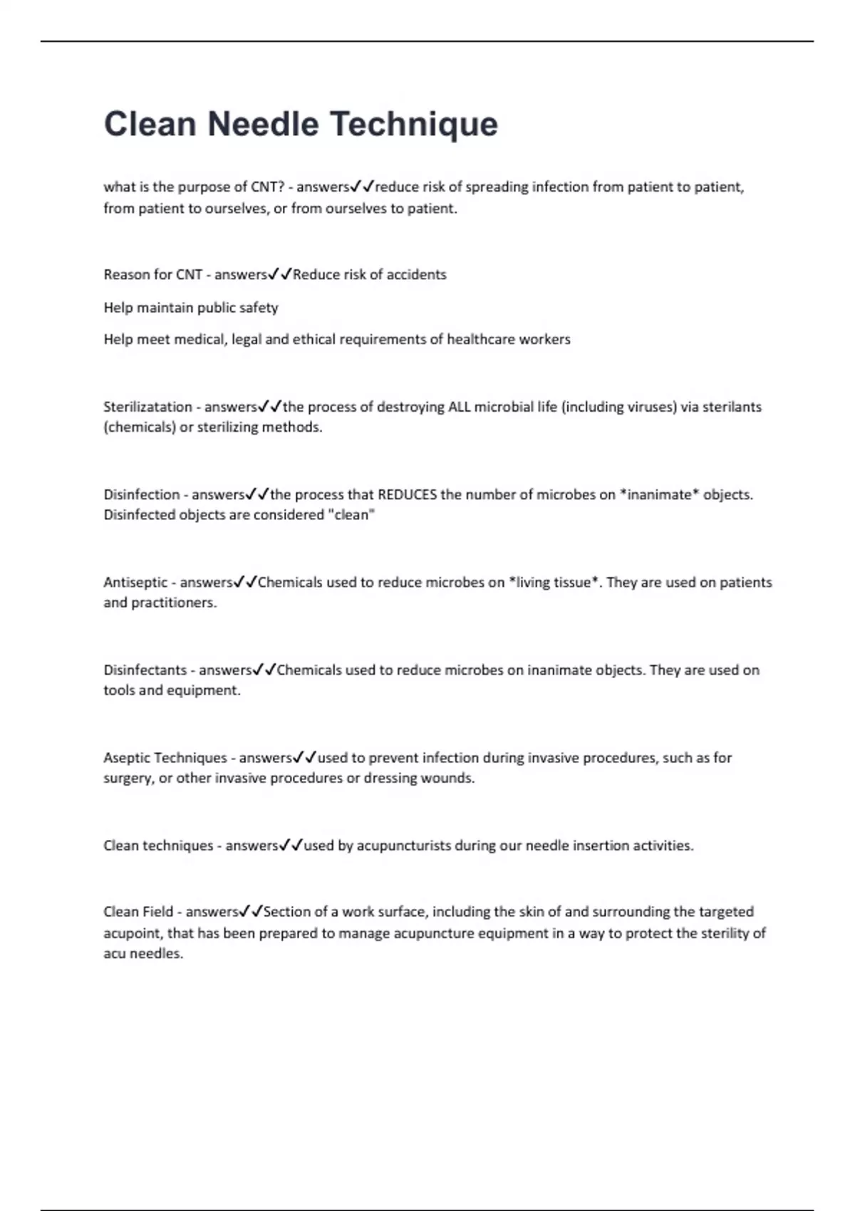Clean Needle Technique what is the purpose of CNT? - answersreduce risk of spreading infection from patient to patient, from patient to ourselves, or from ourselves to patient. Reason for CNT - answersReduce risk of accidents Help maintain public safety Help meet medical, legal and ethical requirements of healthcare workers Sterilizatation - answersthe process of destroying ALL microbial life (including viruses) via sterilants (chemicals) or sterilizing methods. Disinfection - answersthe process that REDUCES the number of microbes on *inanimate* objects. Disinfected objects are considered "clean" Antiseptic - answersChemicals used to reduce microbes on *living tissue*. They are used on patients and practitioners. Disinfectants - answersChemicals used to reduce microbes on inanimate objects. They are used on tools and equipment. Aseptic Techniques - answersused to prevent infection during invasive procedures, such as for surgery, or other invasive procedures or dressing wounds. Clean techniques - answersused by acupuncturists during our needle insertion activities. Clean Field - answersSection of a work surface, including the skin of and surrounding the targeted acupoint, that has been prepared to manage acupuncture equipment in a way to protect the sterility of acu needles.