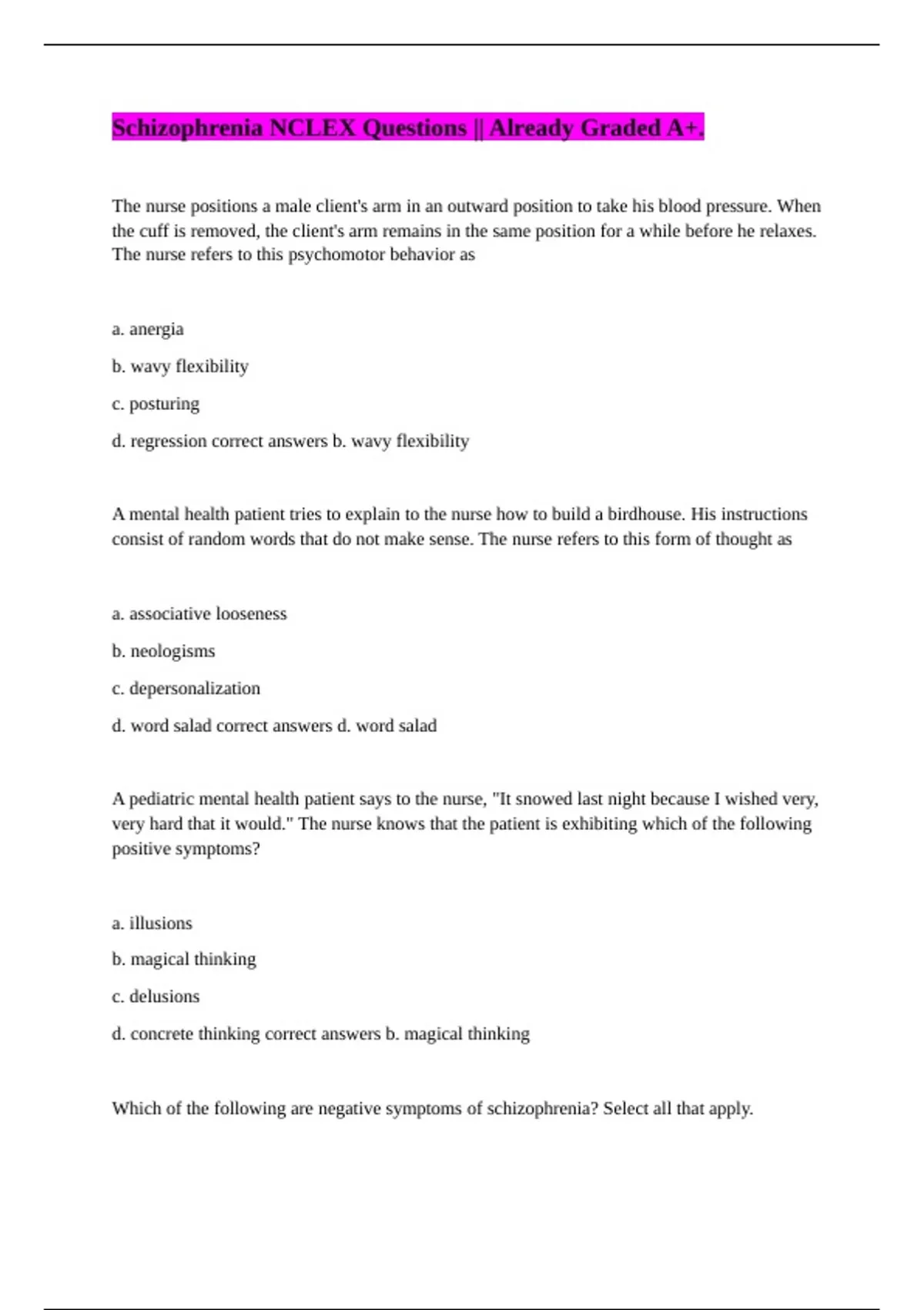 Schizophrenia NCLEX Questions || Already Graded A+.